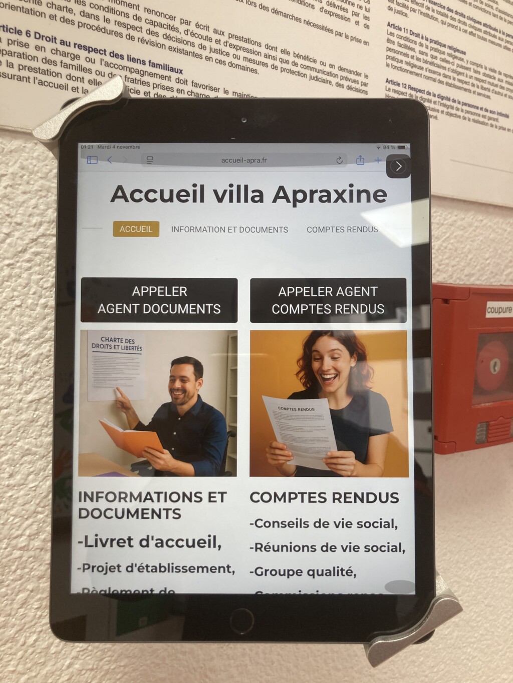 En effet, il joue un rôle important dans l’accès des personnes accompagnées à l’information. À l’entrée de IRSAM Villa Apraxine, une tablette est installée. Cet outil innovant a été conçu pour répondre à un besoin concret : faciliter l’accès aux informations essentielles de la structure. On y trouve par exemple le projet d’établissement, les derniers articles parus sur le mini site de IRSAM Villa Apraxine, etc.