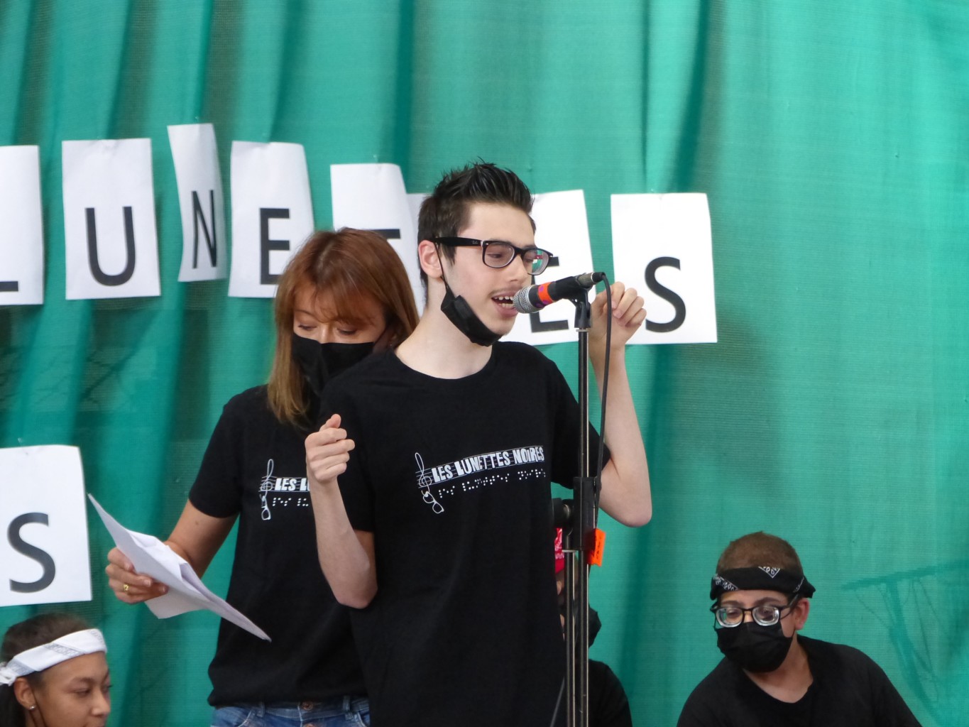 Le vendredi 25 juin dernier a eu lieu la fête de fin d’année de l’Arc-en-Ciel. Ce fut l’occasion pour le groupe de musique des « lunettes noires » de se produire pendant près de 45 minutes, en reprenant différents classiques musicaux, passant de Kendgi Jirac à Charles Aznavour ou encore les enfoirés. En trio, solo ou tous ensemble, nous avons pu découvrir et entendre avec plaisir une partie de leur répertoire, appris et répété depuis ces 2 dernières années.