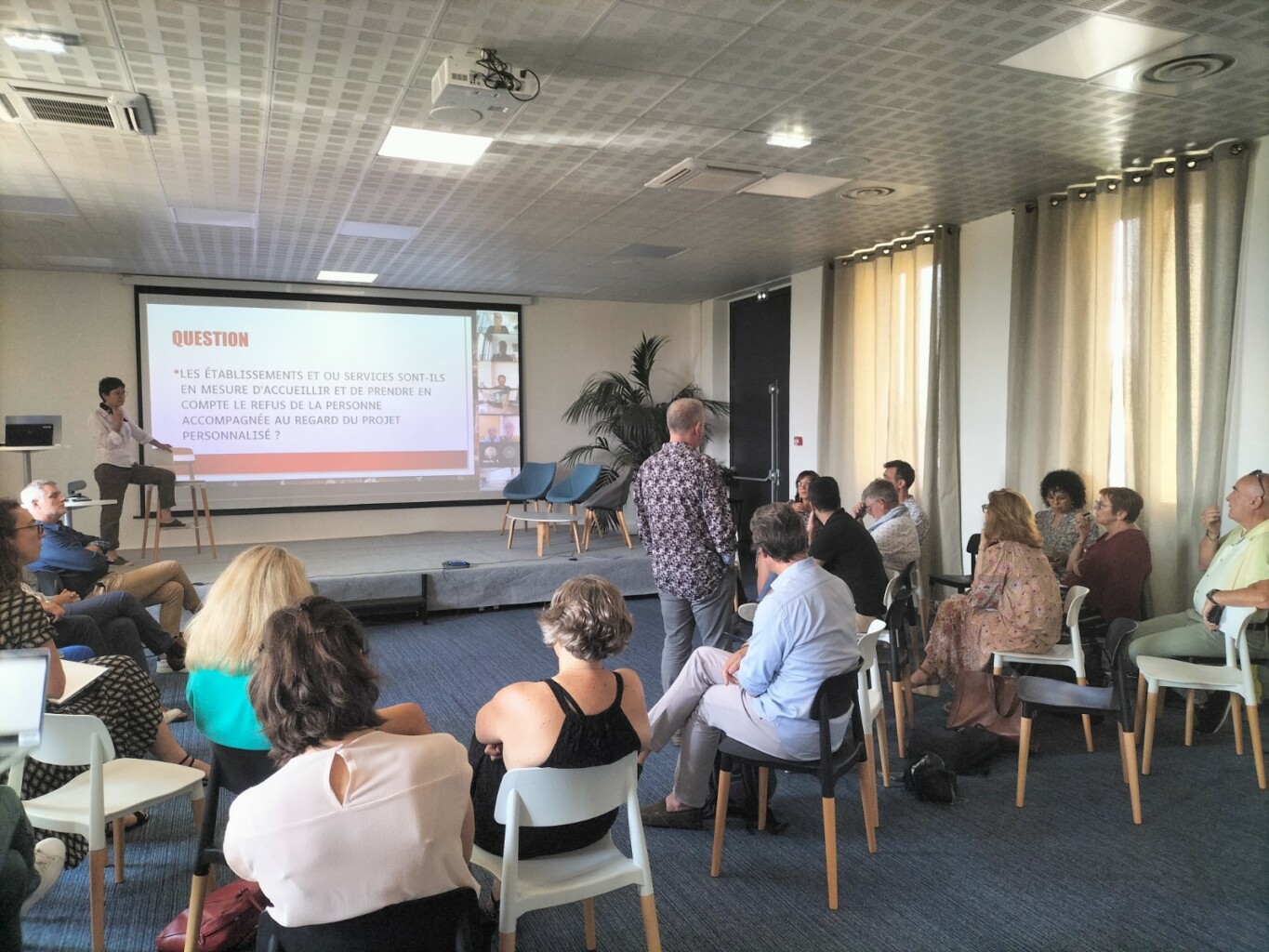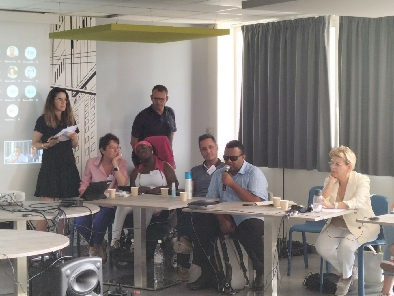 Un thème de fond était proposé autour du concept d’autodétermination, particulièrement mis en avant dans le secteur du handicap, pour que la personne puisse développer ses compétences et sa capacité d’agir. Une première pour la pré Assemblée Générale de notre association avec la venue de Marc PRENEVOST, Président du Groupe Evie, au Québec, en lien avec le Réseau Francophone en Déficience Sensorielle et du Langage, dans lequel notre association est engagée depuis de longues années. Ce fut l’occasion également de mettre en avant des actions concrètes pour illustrer l’intérêt de cette approche d’autodétermination dans l’accompagnement de personnes vulnérables. Quatre binômes sont ainsi intervenus, Jean-Philippe SEVAGAMY et Yannick NENEZ du SAMSAH DV à La Réunion, Quentin MAHE et Véronique DESFORGES du foyer IRSAM Les Nénuphars, Hulya KAYACI et Karine VERNET du Foyer IRSAM Clairefontaine à Lyon et Annie TASSY du siège IRSAM et Salima KARANI, résidente à Simon de CYRENE Marseille. Hulya étant sourde, l’ensemble des interventions ont été traduites en LSF par Déborah VAYRETTE et Patricia GABORIT, toutes les 2 interprètes IRSAM, montrant ainsi l’importance de cette accessibilité dans notre secteur. Pour compléter ces témoignages, Zahra FARRGUTE, mère d’un enfant en situation de handicap rare, suivi par l’ERHR IRSAM PACA et Corse a pu s’exprimer afin d’avoir un regard d’aidant sur cette approche fondamentale pour notre secteur. Cette table ronde était animée par Valentine DRIEUX, pilote ERHR Paca Corse et proposée en présentiel pour les équipes IRSAM marseillaises et en visioconférence pour les équipes réunionnaises, niçoises et lyonnaises. L’Assemblée Générale s’est ensuite poursuivie avec le rapport moral présenté par Ambroise ARNAUD, Président avec les faits marquants 2021 puis le bilan social et bilan financier.