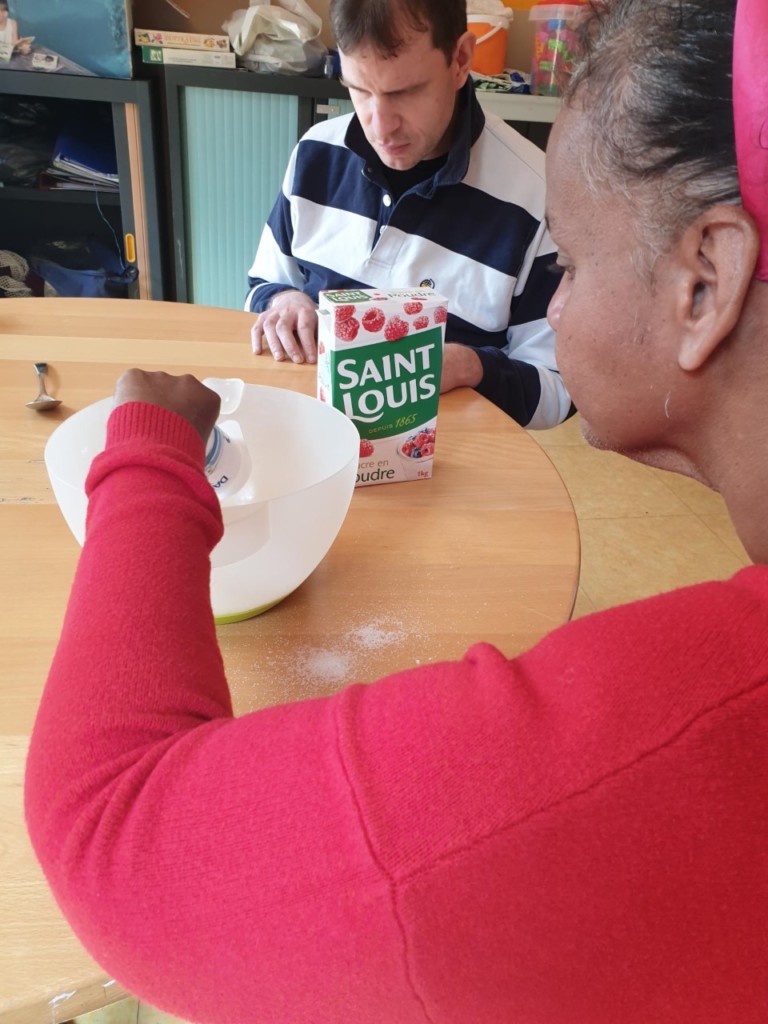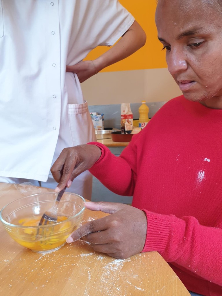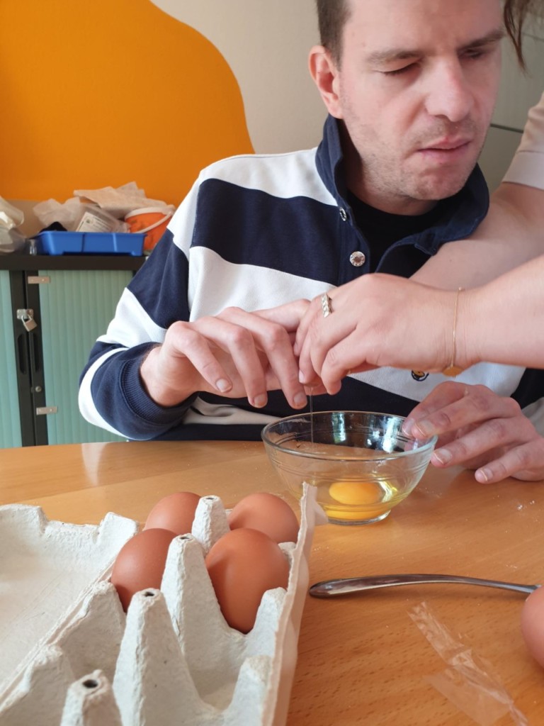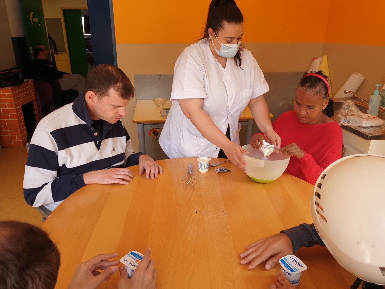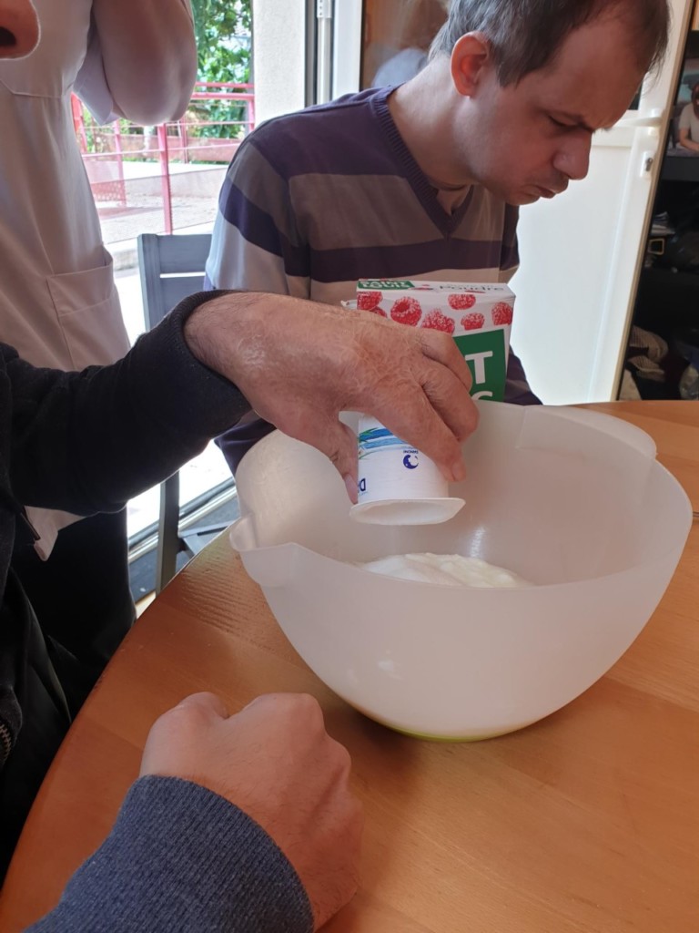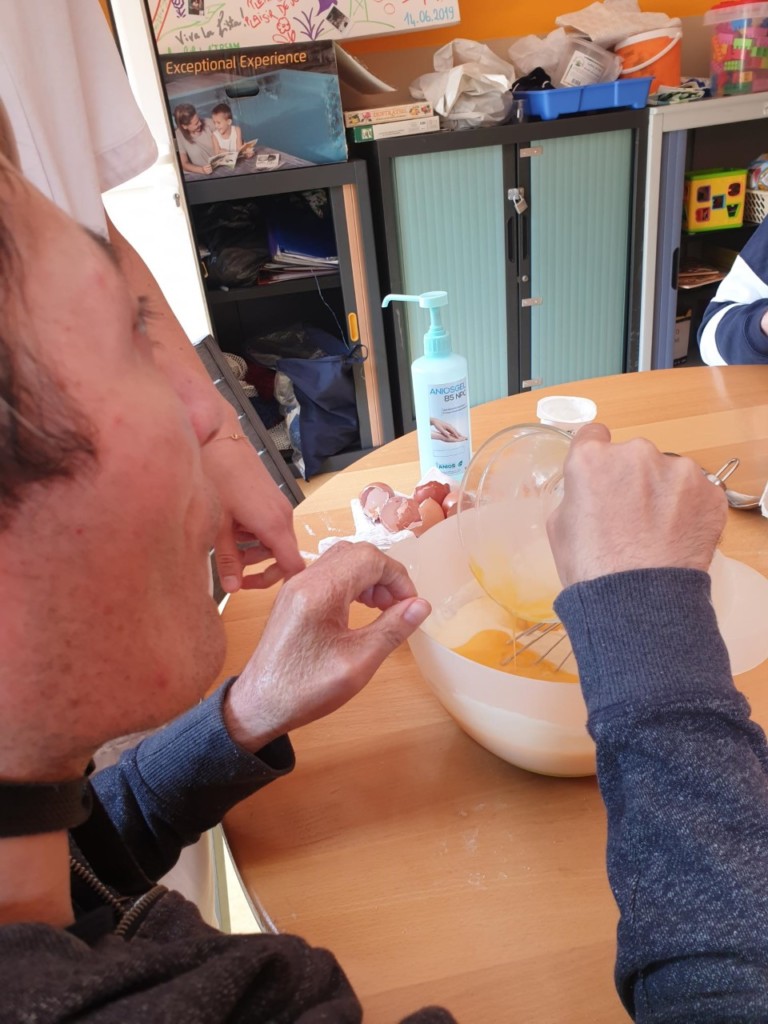 Ce matin 28 mai, Kenza (stagiaire AES) a proposé un atelier cuisine à Cédric, Karim, François et Angéline. Au programme, confection d’un gâteau au yaourt à la vanille ! Cela pour viser différents objectifs : travailler la motricité fine et l’autonomie dans les différents gestes, viser le respect des consignes, et enfin stimuler la sensorialité (écoute, tactile, goût, odorat).