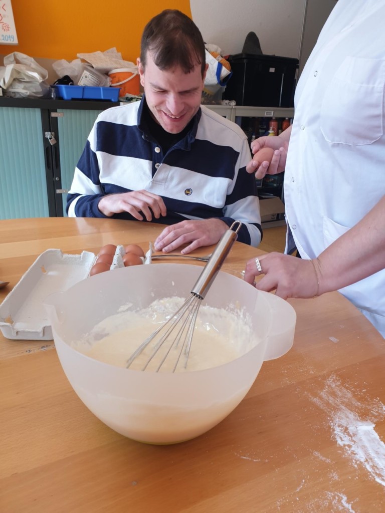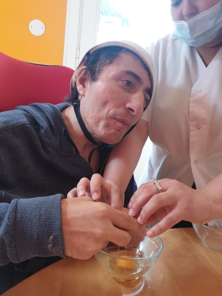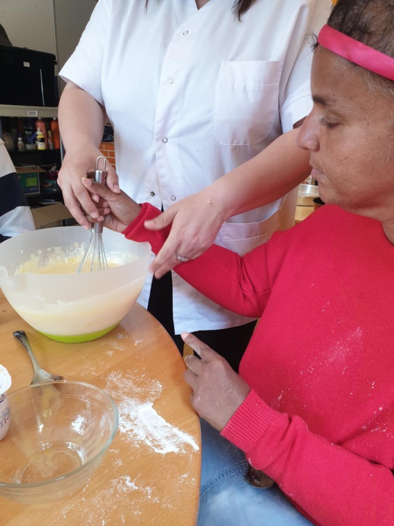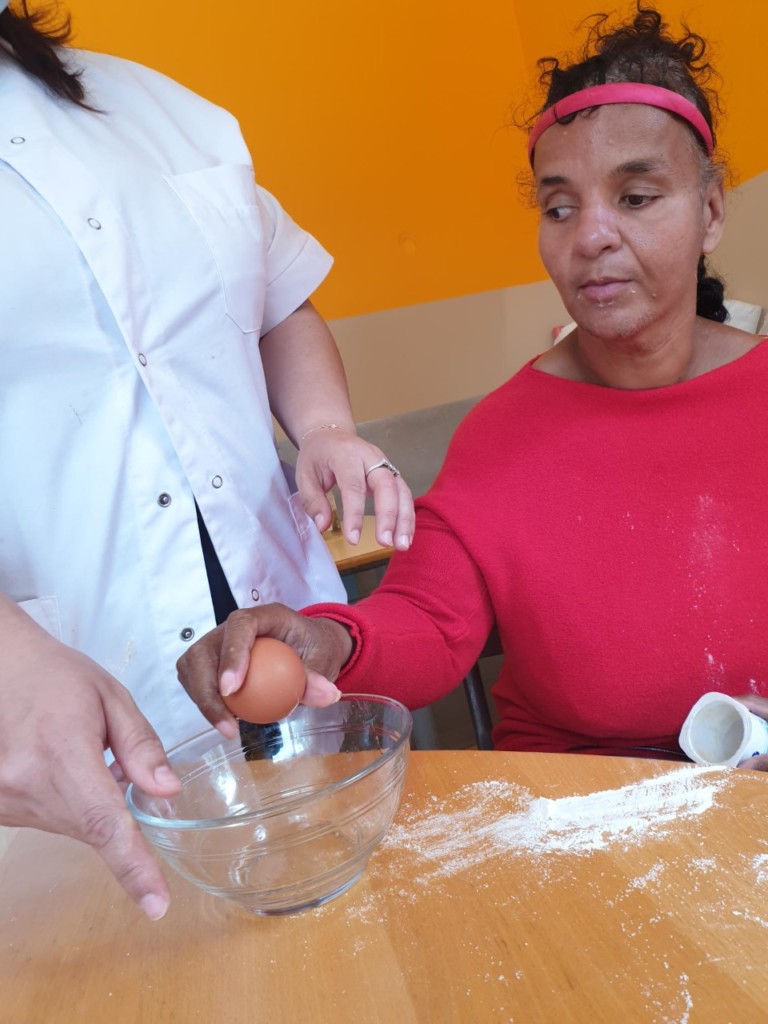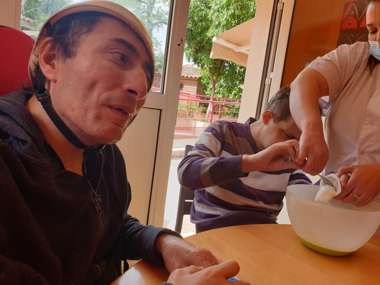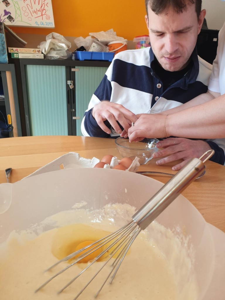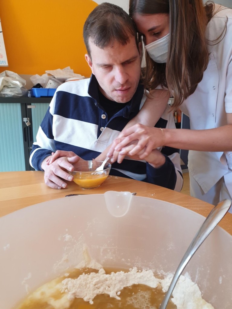 Ce matin 28 mai, Kenza (stagiaire AES) a proposé un atelier cuisine à Cédric, Karim, François et Angéline. Au programme, confection d’un gâteau au yaourt à la vanille ! Cela pour viser différents objectifs : travailler la motricité fine et l’autonomie dans les différents gestes, viser le respect des consignes, et enfin stimuler la sensorialité (écoute, tactile, goût, odorat).