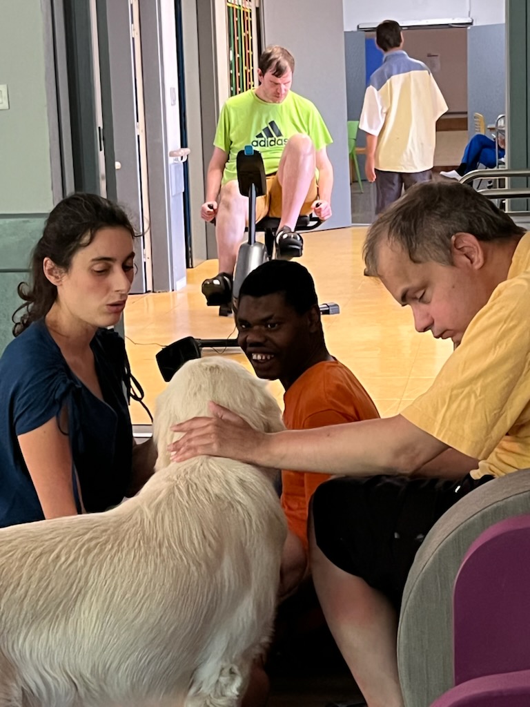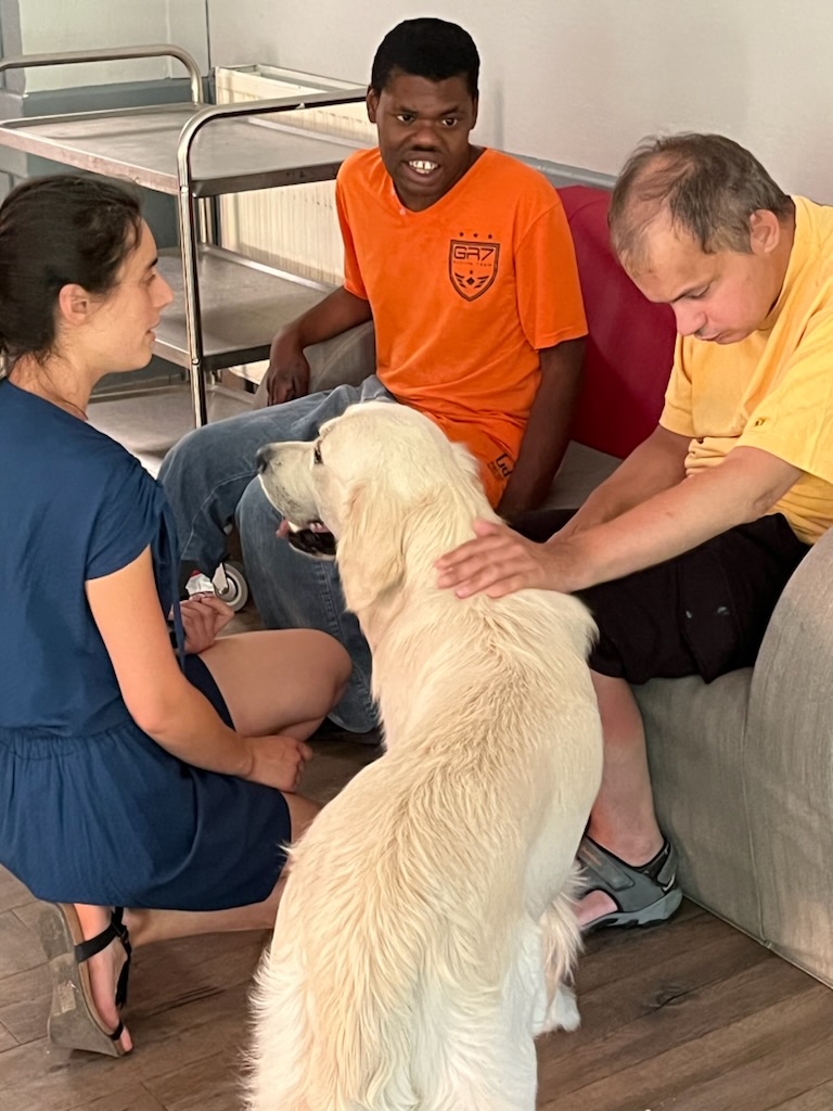 Rio, notre chien médiateur est le fidèle compagnon des résidents de la MAS. Il est un lien affectif, un soutien émotionnel, un contact chaleureux. Il aime être caressé, papouillé, et apprécie plus que tout jouer et sortir ! Ce qui amène du dynamisme et beaucoup de plaisir pour les résidents.