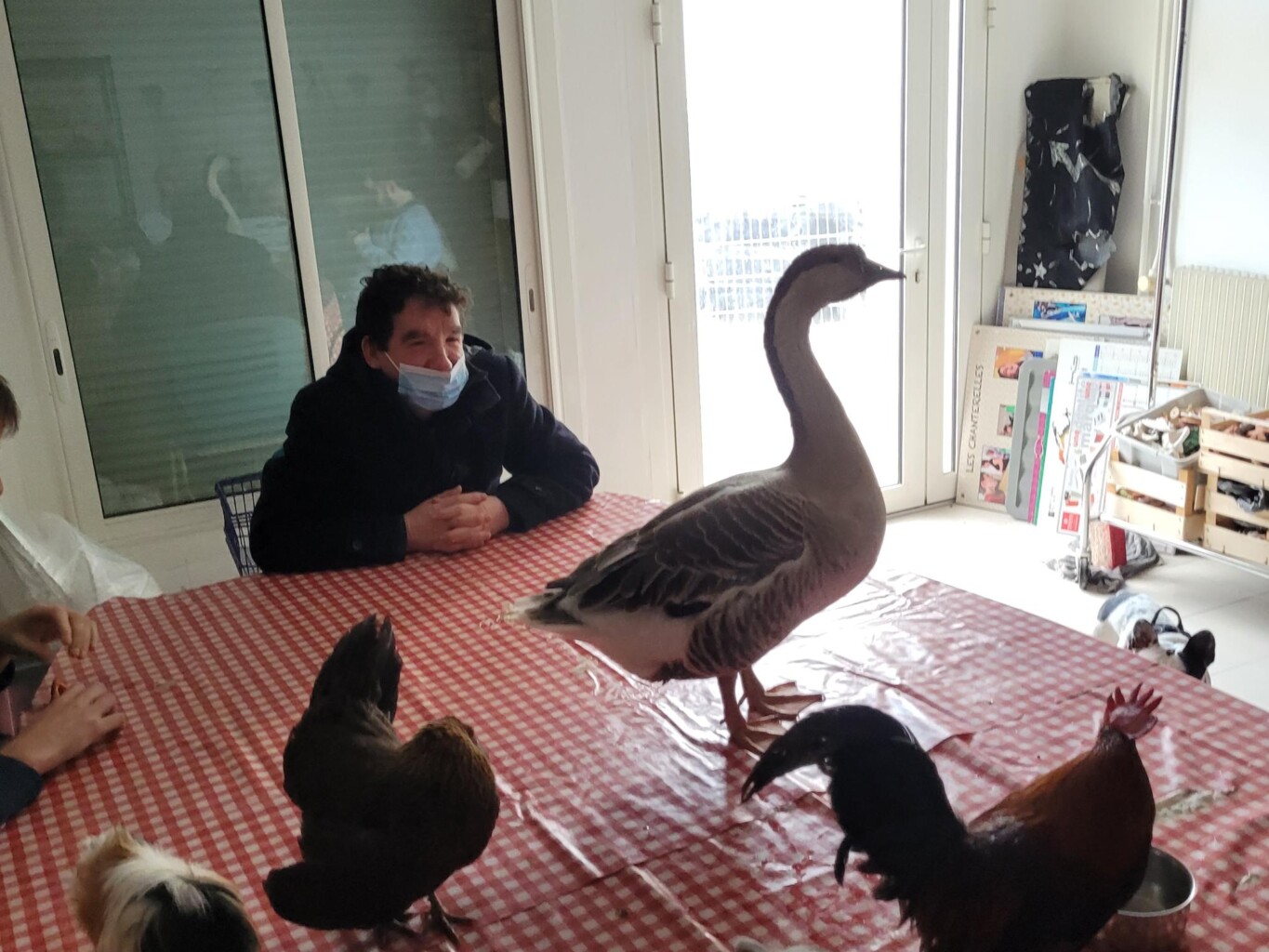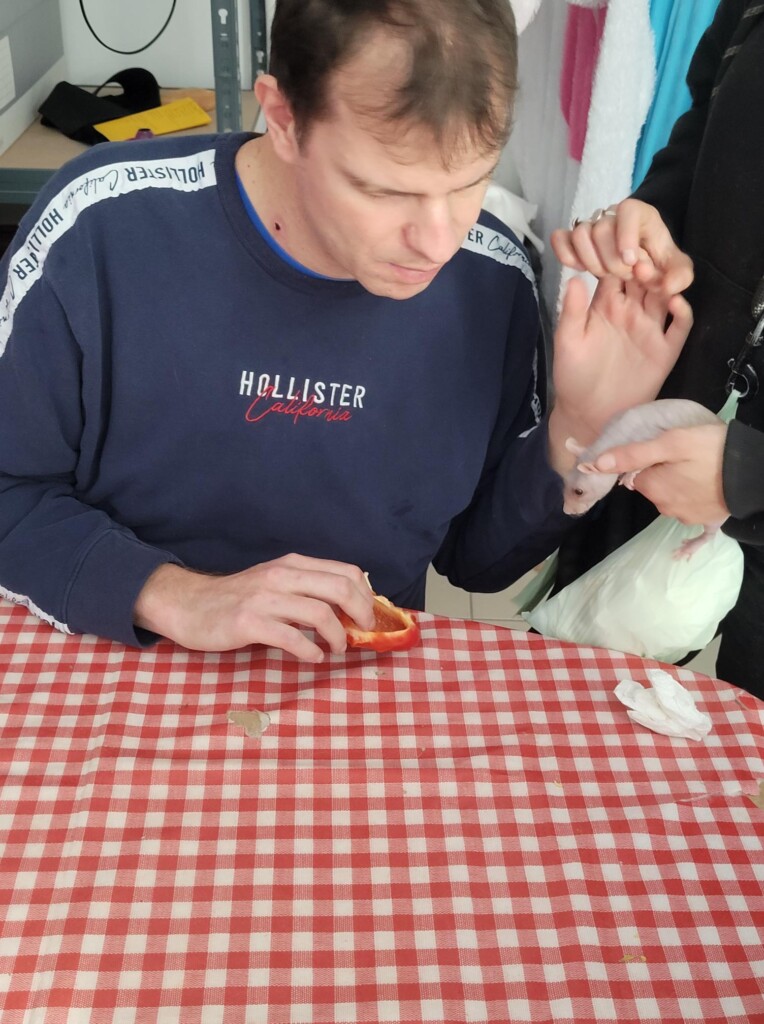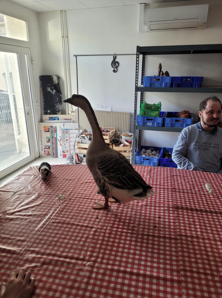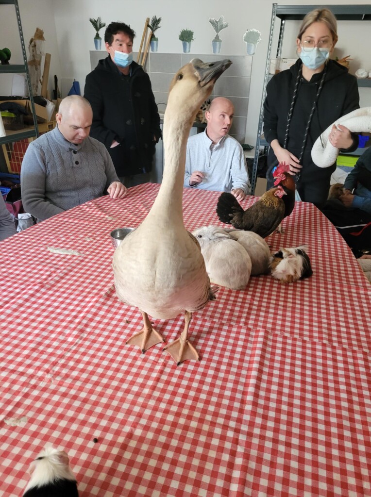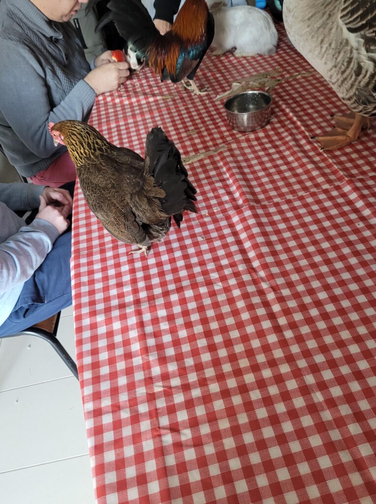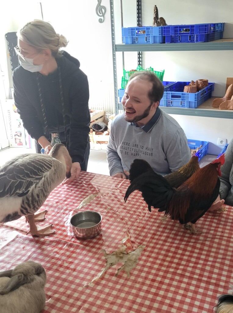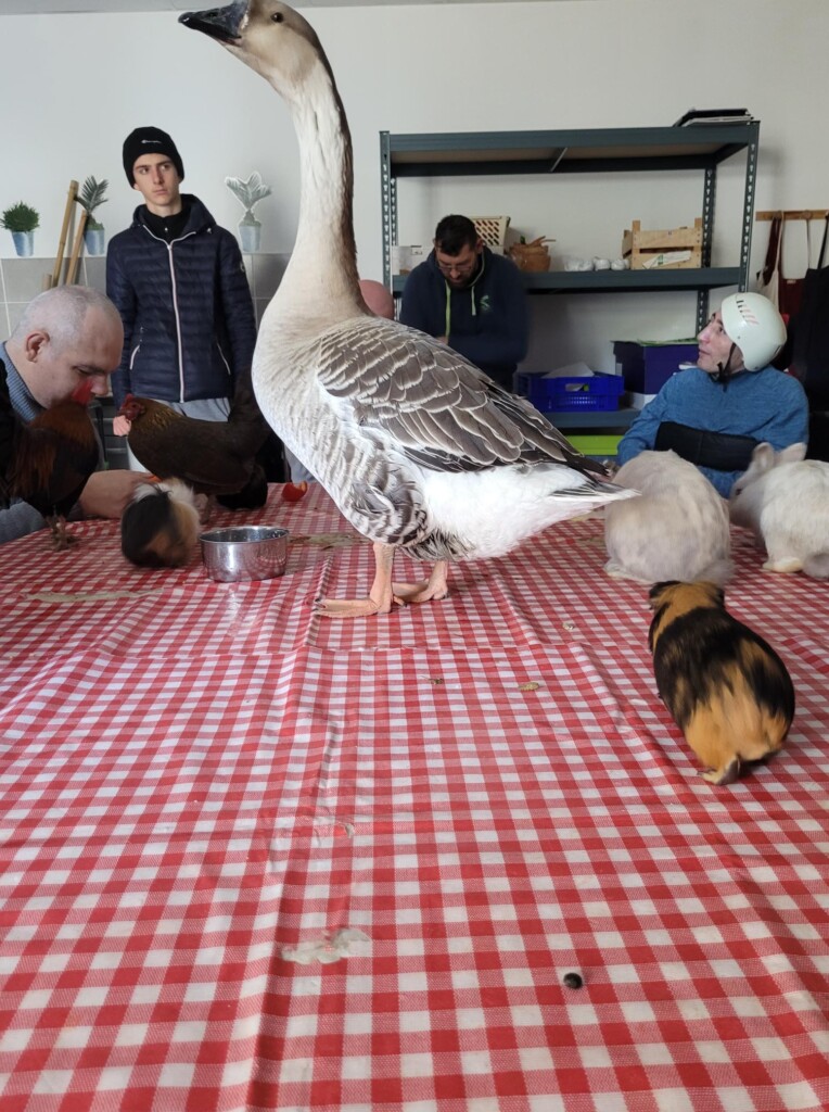 Avec les habituels lapins aux poils si doux, les cochons d’indes et leurs couinements bien particuliers, la poule… cette fois-ci une oie nous a également fait l’honneur de sa présence. Michel en a eu un peu peur… Il faut dire que l’oie peut être impressionnante ! Aussi et d’autant plus surprenant… il était également possible de toucher une étrange souris sans poil et un bébé couleuvre.