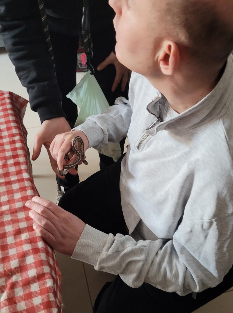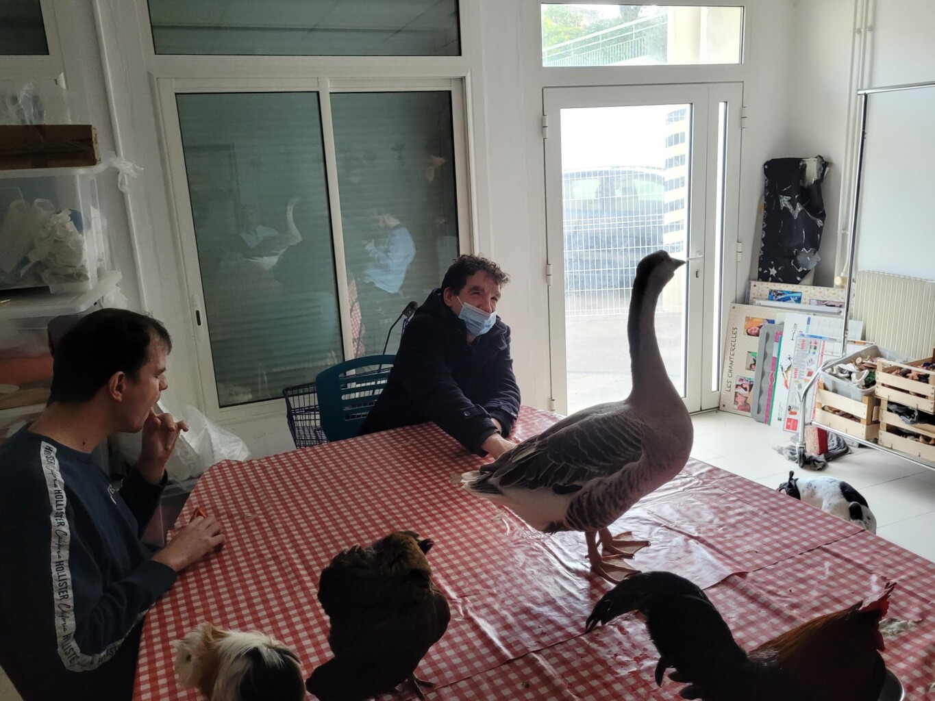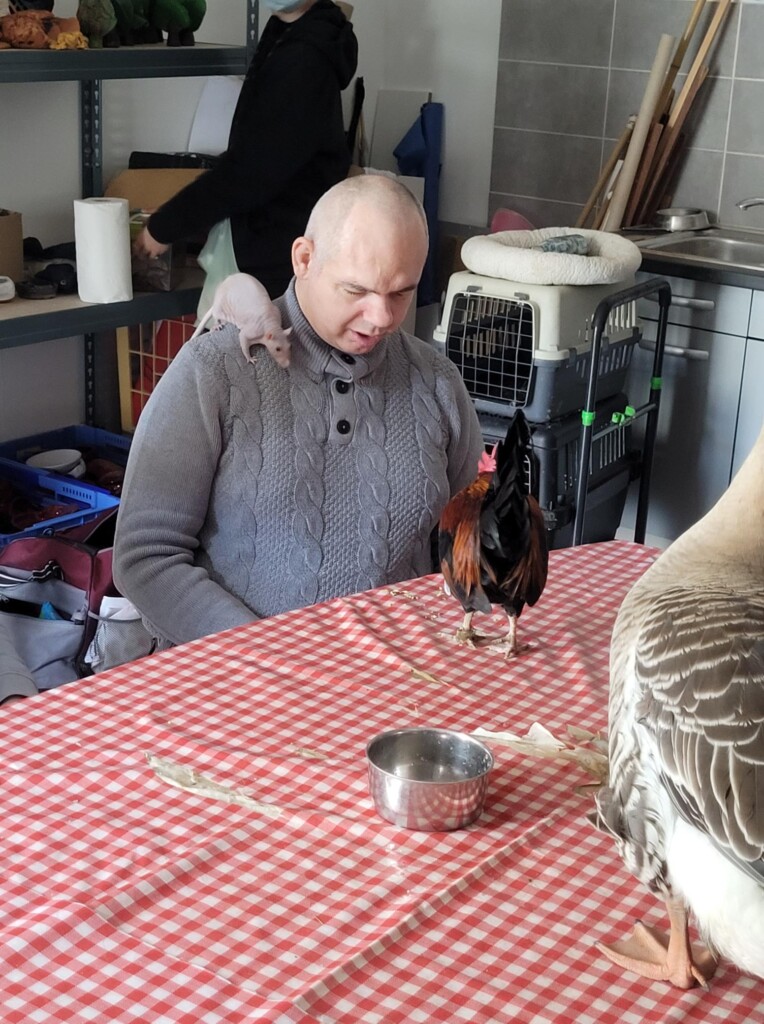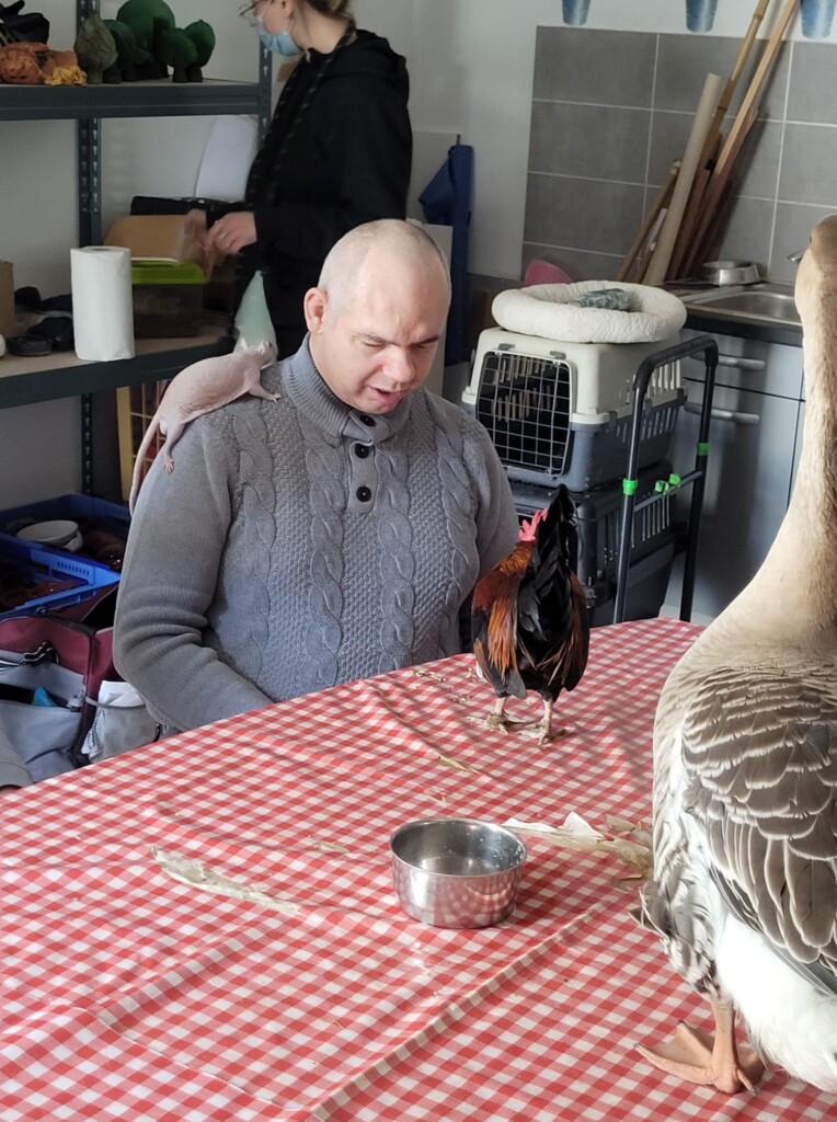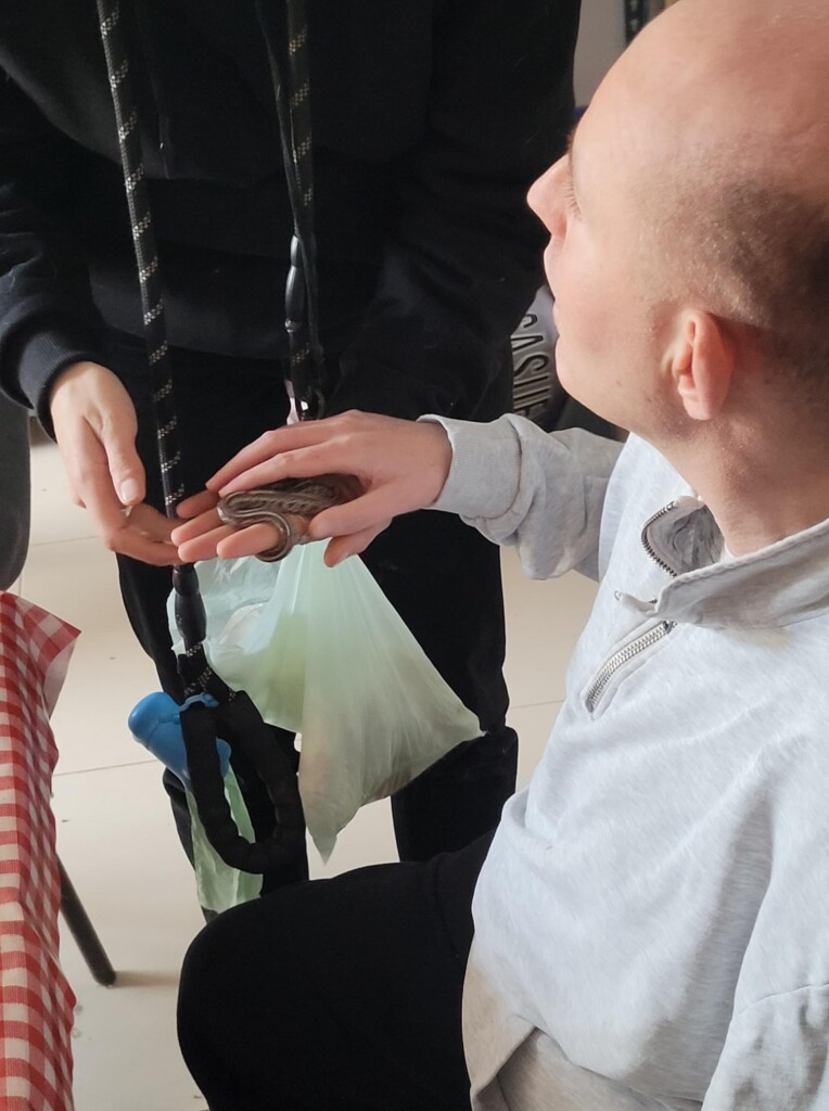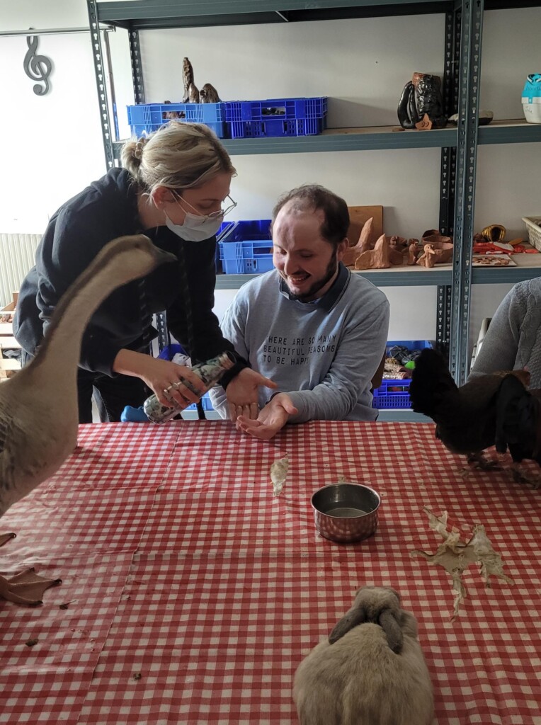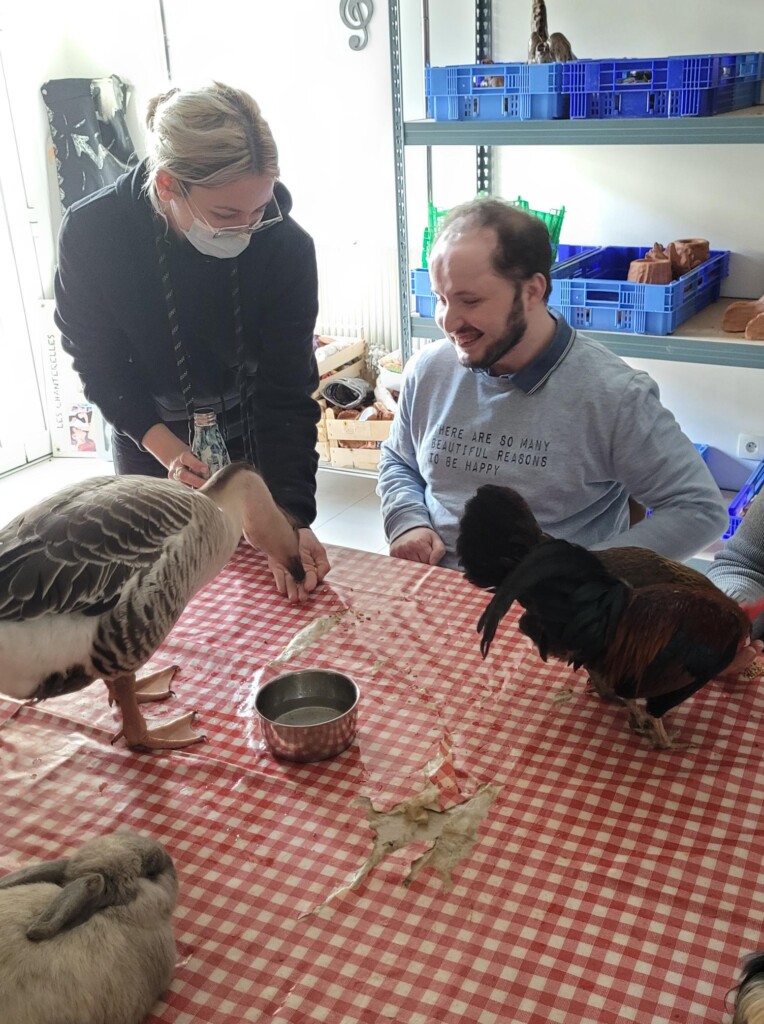 Avec les habituels lapins aux poils si doux, les cochons d’indes et leurs couinements bien particuliers, la poule… cette fois-ci une oie nous a également fait l’honneur de sa présence. Michel en a eu un peu peur… Il faut dire que l’oie peut être impressionnante ! Aussi et d’autant plus surprenant… il était également possible de toucher une étrange souris sans poil et un bébé couleuvre.