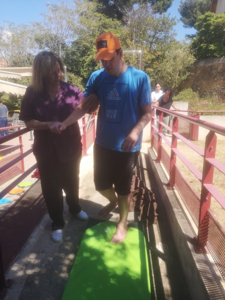 Nos parcours psychomoteurs sont spécialement conçus pour travailler l’équilibre, les coordinations motrices et la prise de conscience corporelle de manière ludique. Composés de divers obstacles et jeux sensoriels, ces parcours favorisent la motricité globale tout en s’adaptant aux capacités de chaque résident. En apprenant à franchir des obstacles, à se déplacer selon des consignes simples ou à manipuler des objets, les résidents gagnent en confiance en eux et en autonomie. Cet été, nous avons réalisé des parcours pieds nus afin de solliciter d’avantage les récepteurs plantaires et la proprioception.