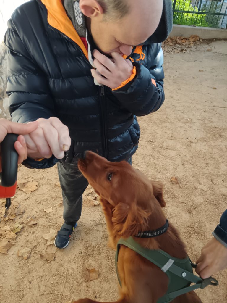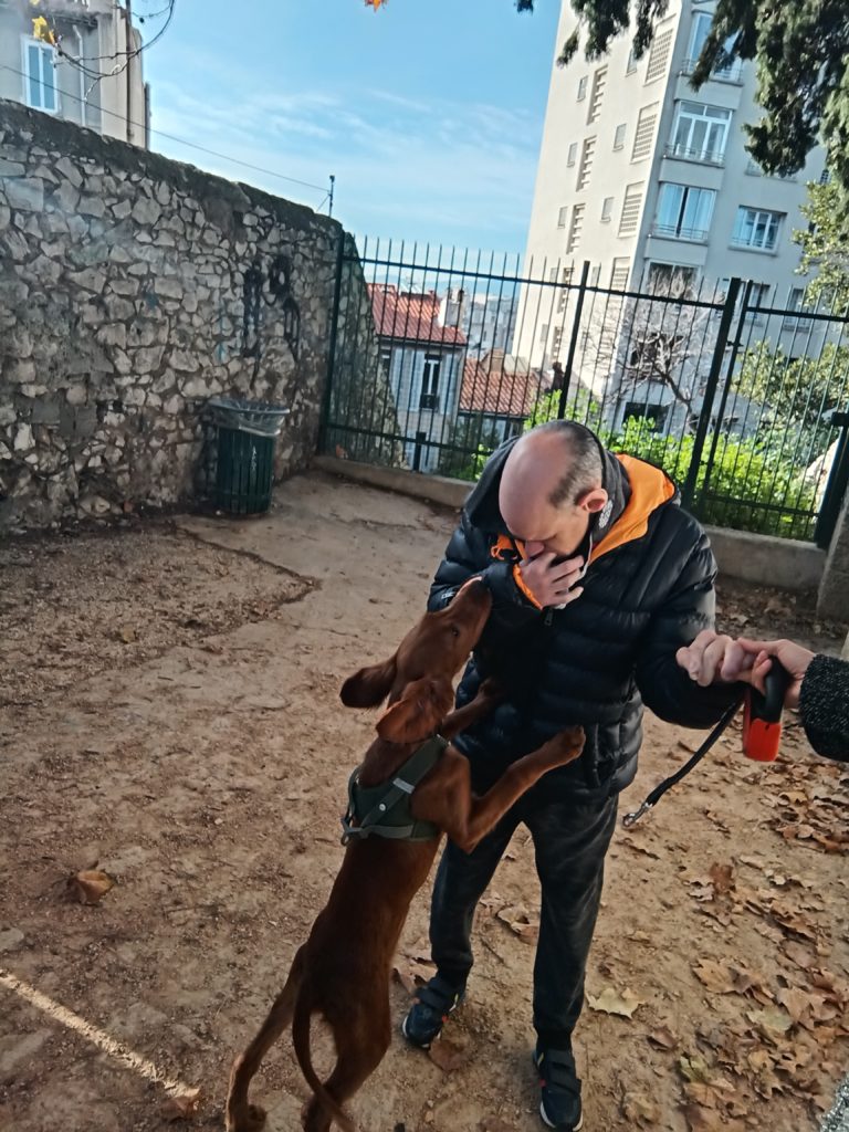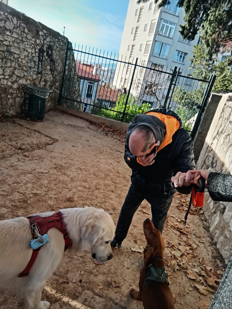 à Mathieu de toucher un chiot au parc,