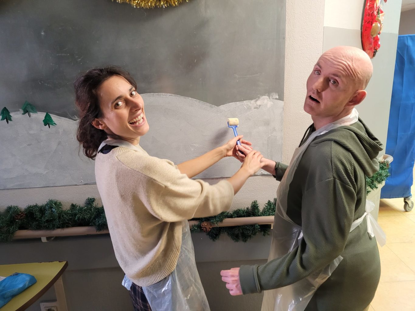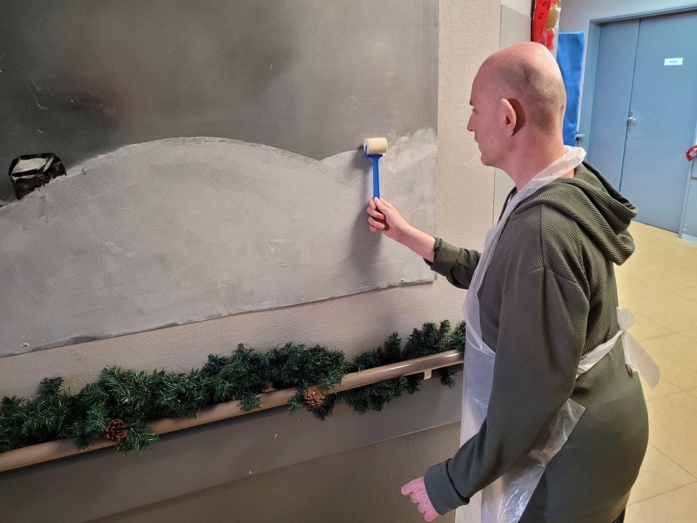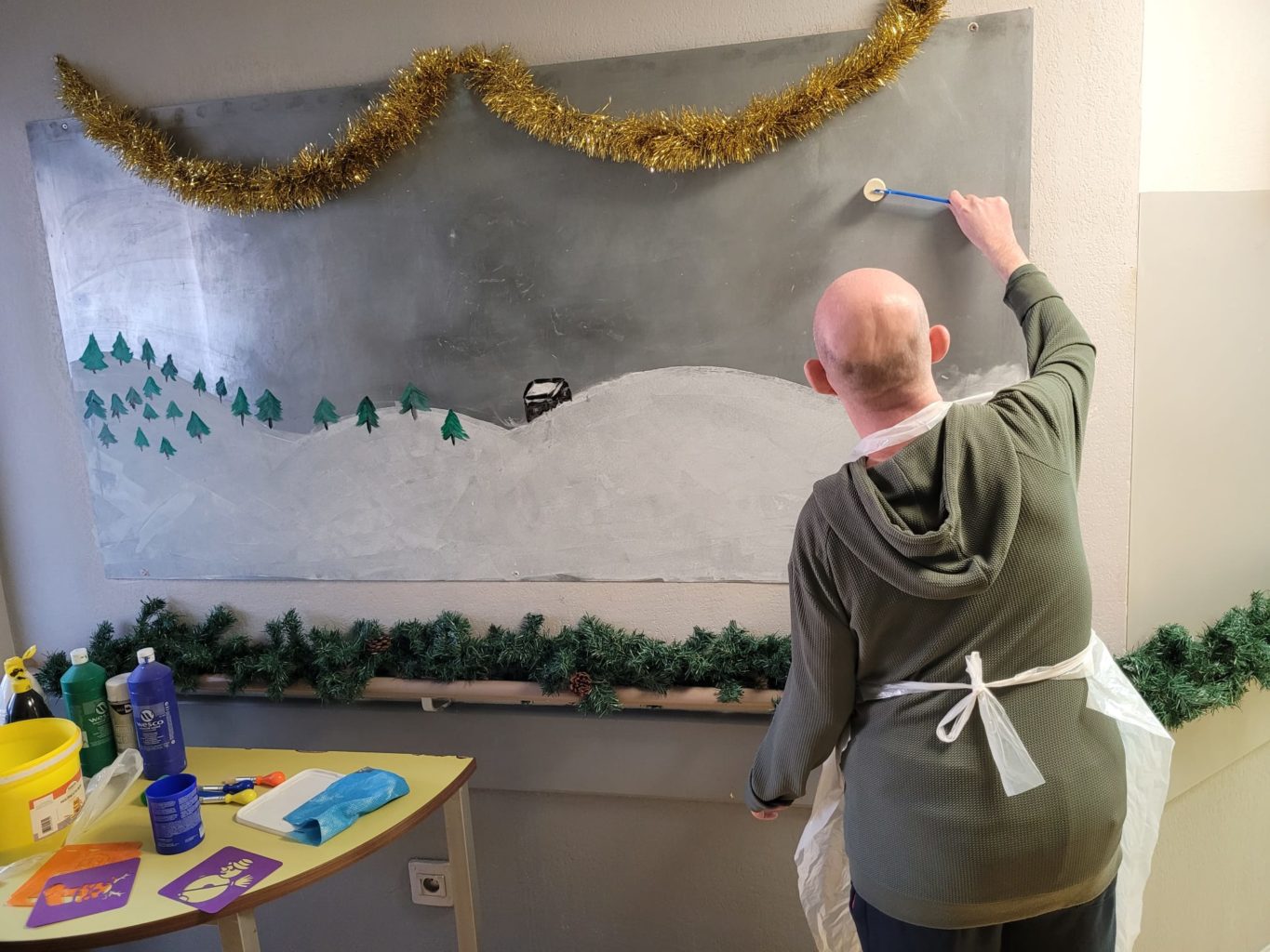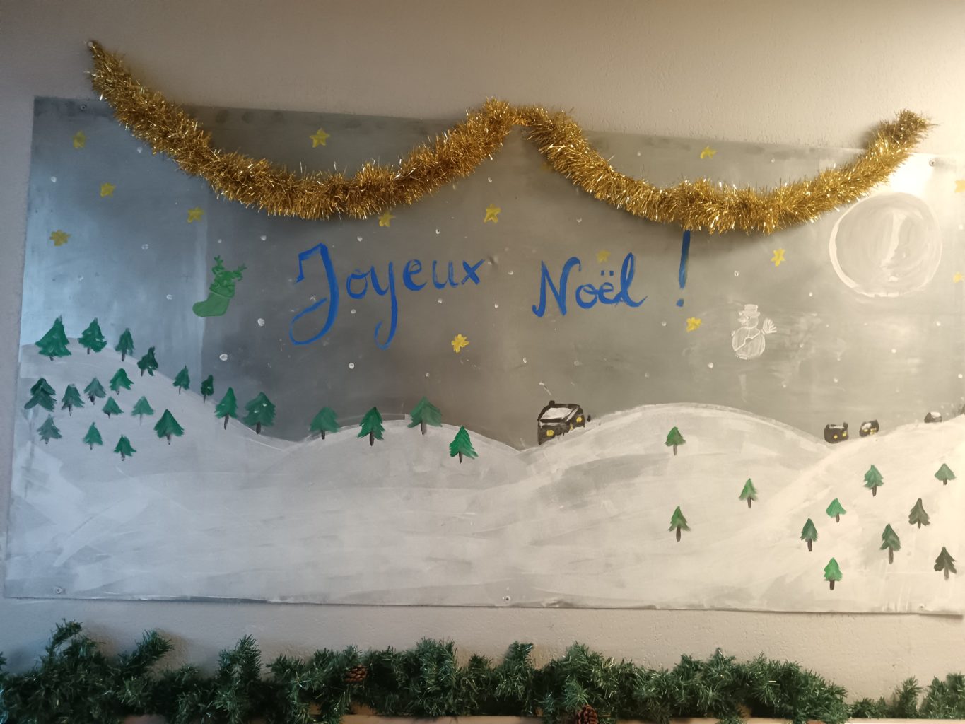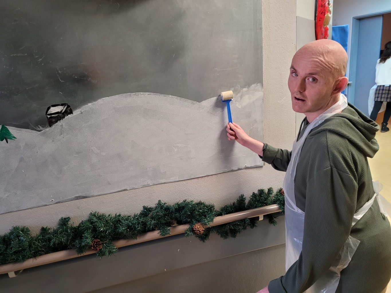 Noël a été une période particulièrement festive à la MAS! L’esprit de fête s’est installé et la créativité de chacun est mise à l’honneur. Cette année, Angeline et Thomas ont participé à la peinture d’un décor hivernal dans le hall d’entrée.