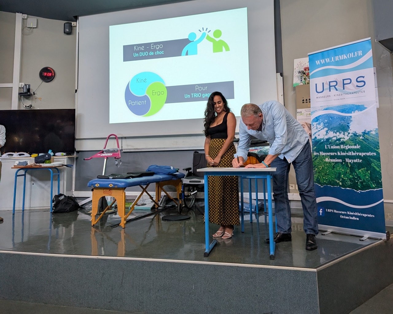 Pour formaliser cette collaboration, la Charte Interprofessionnelles de Santé a été signé par l’Union Régionale des Masseurs Kinésithérapeutes libéraux Réunion Mayotte, représentée par son Président, Eric WAGNER, et EqLAAT 974, portée par l’Association IRSAM, représentée par sa Directrice Josette INFANTE.