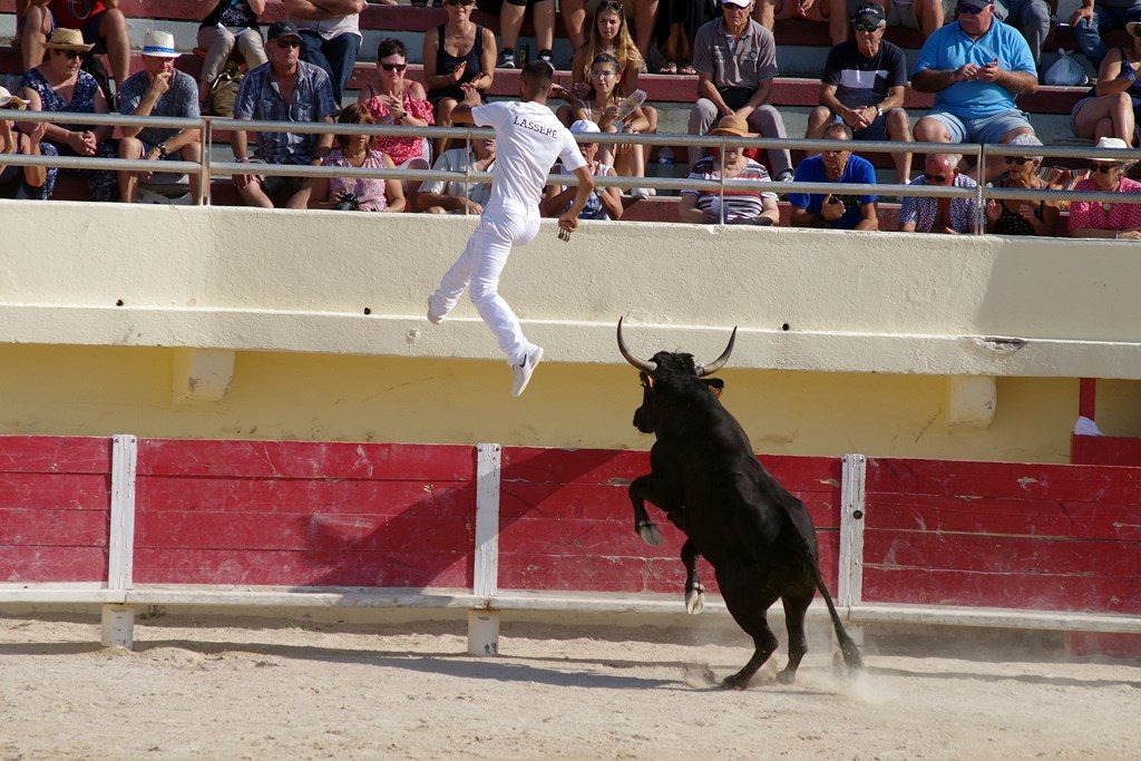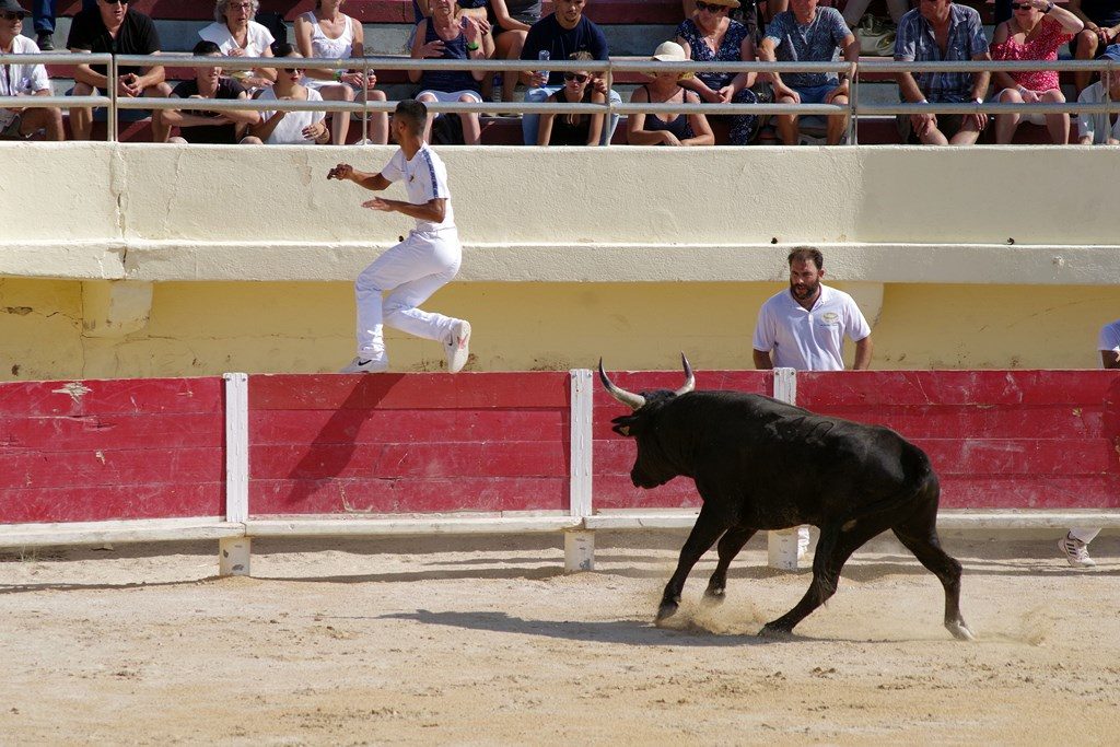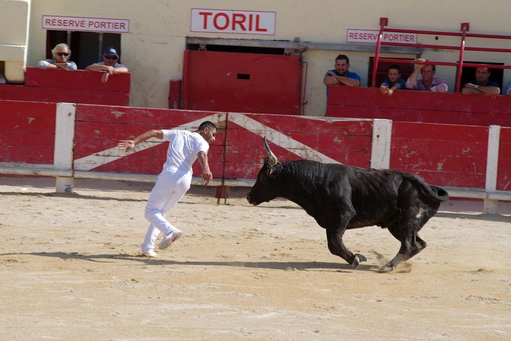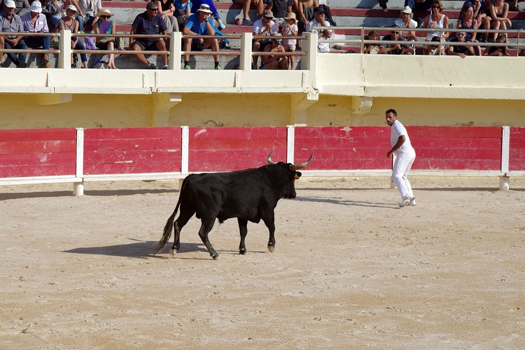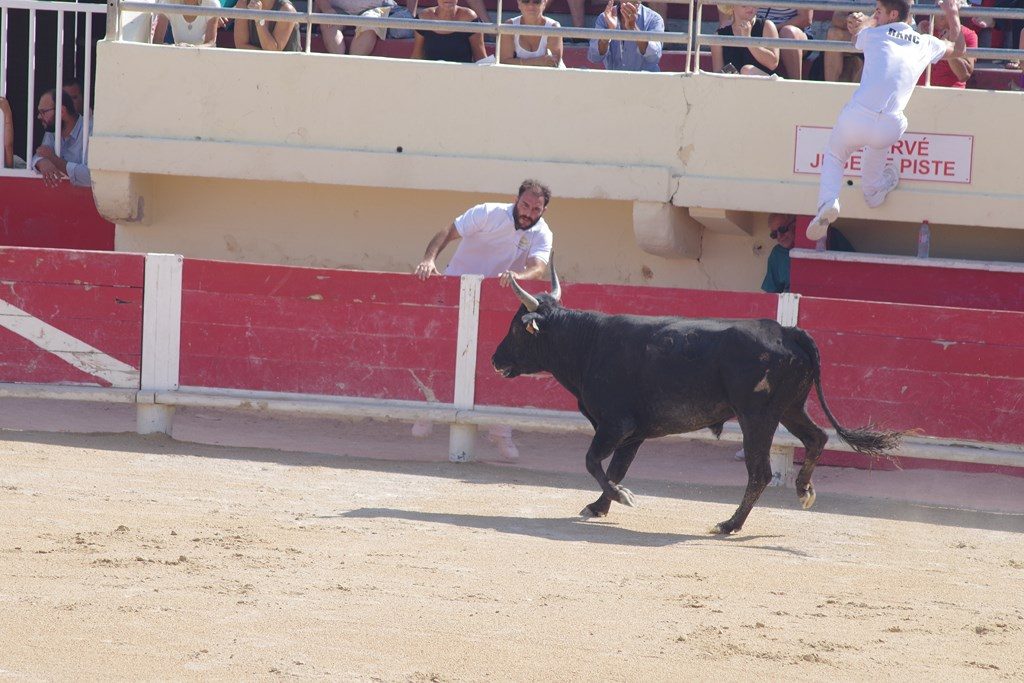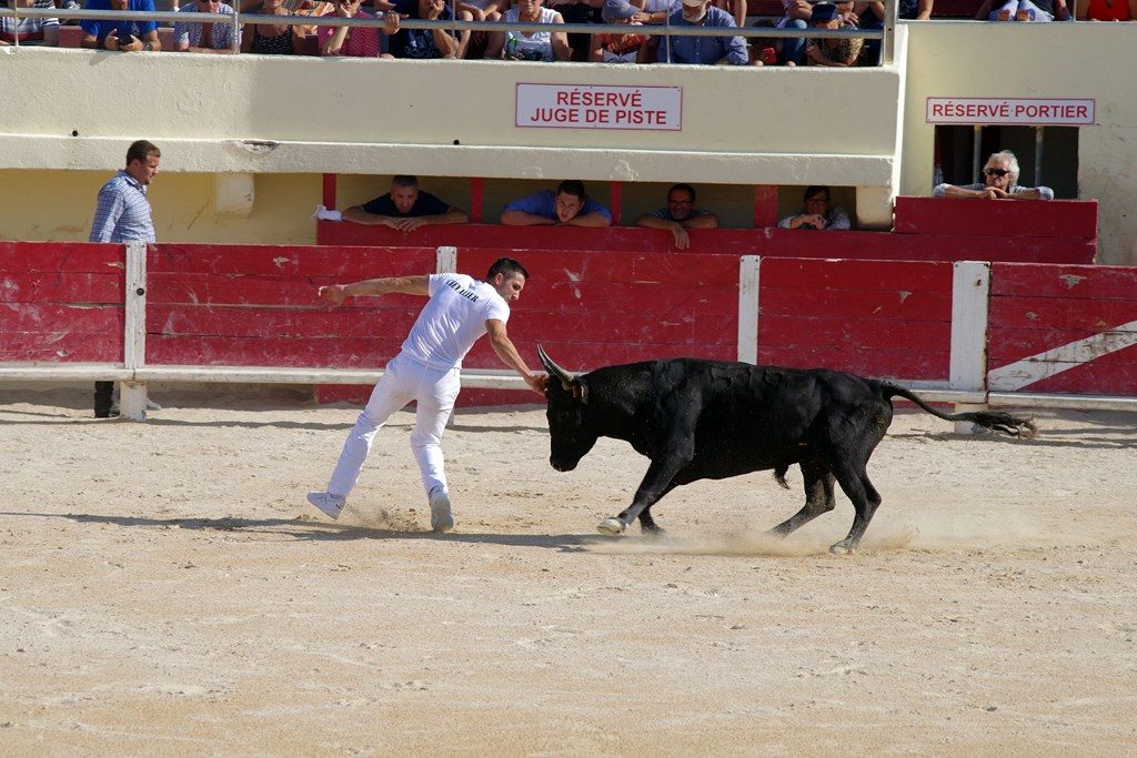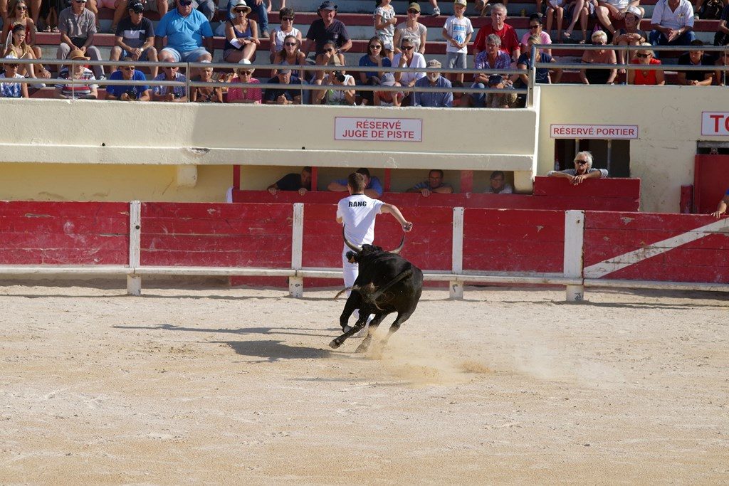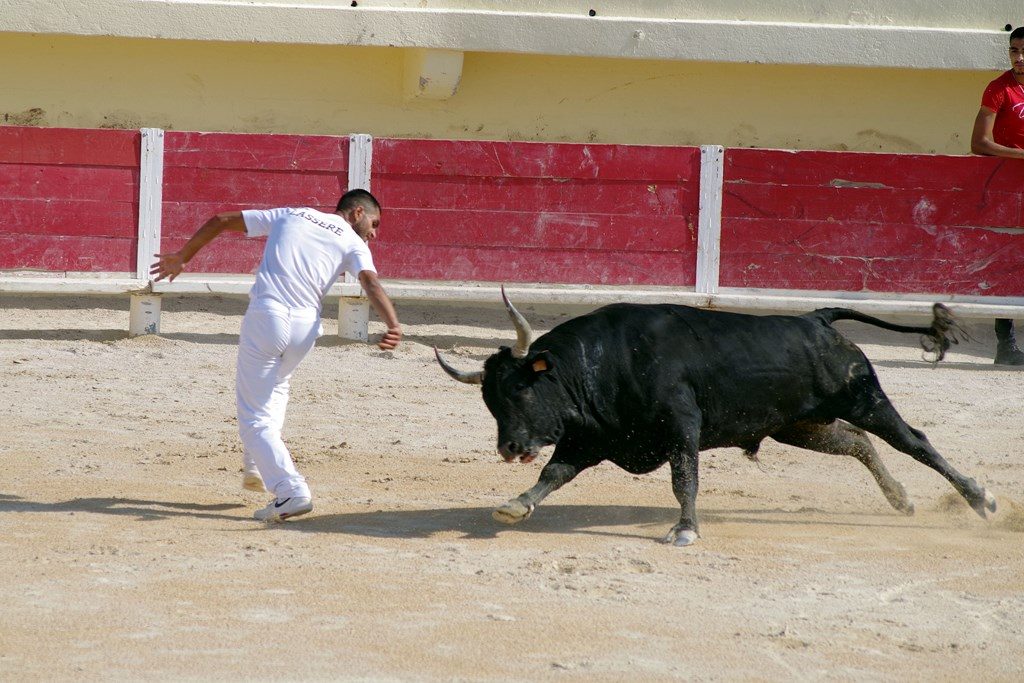 La course camarguaise, ça n’est pas de la Corrida certes, et même si il y a un coté Interville assez amusant, personnellement je regrette et je suis totalement contre le fait que parfois, lorsque les bêtes sautent par dessus les barrières et pour les faire rentrer à nouveau dans l’arène, les organisateurs utilisent des genres de »pics » montés au bout de leurs lances pour faire sortir les taureaux… Les animaux peuvent également se blesser en sautant par dessus les rembardes… Quand aux raseteurs, ils risquent aussi beaucoup mais ça…c’est le risque, c’est le jeu dirons certains…Ce « sport » reste tout de même bien loin des cruelles et pitoyables Corridas et c’est tant mieux !