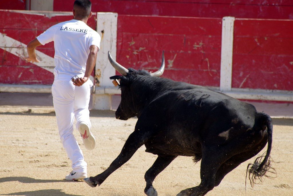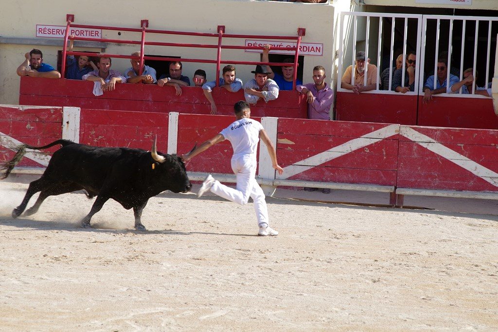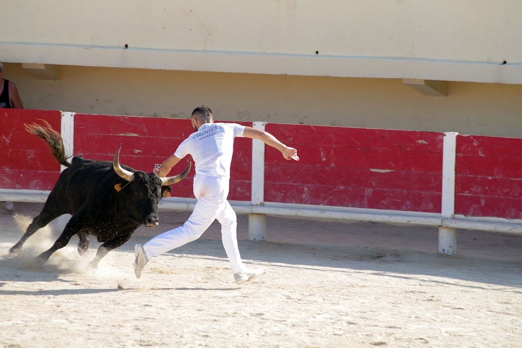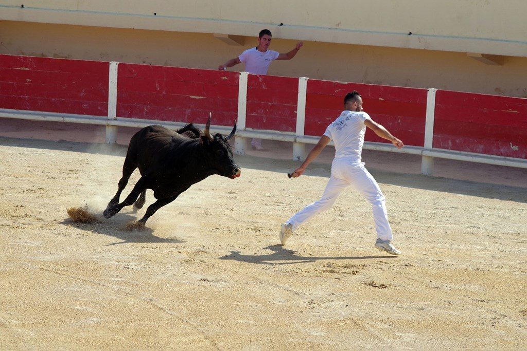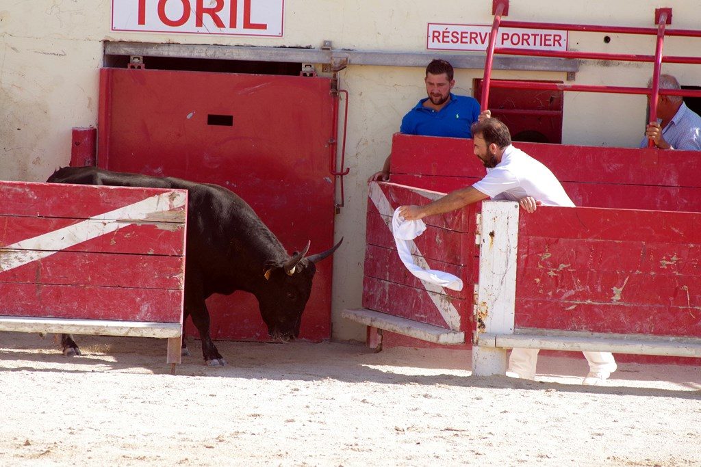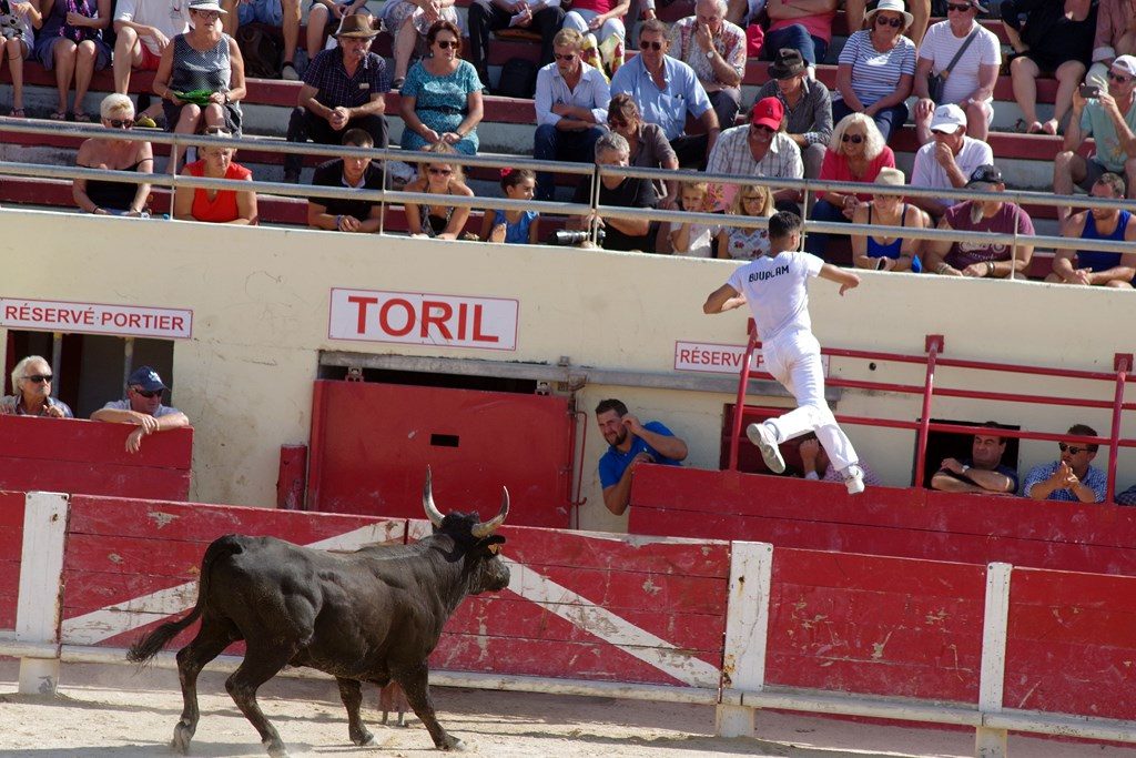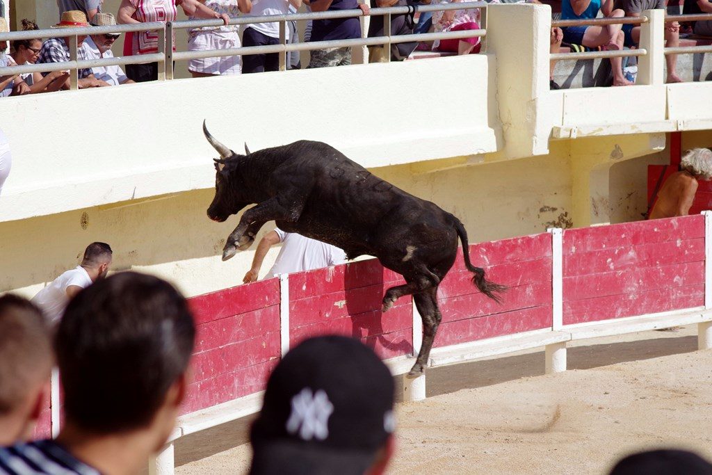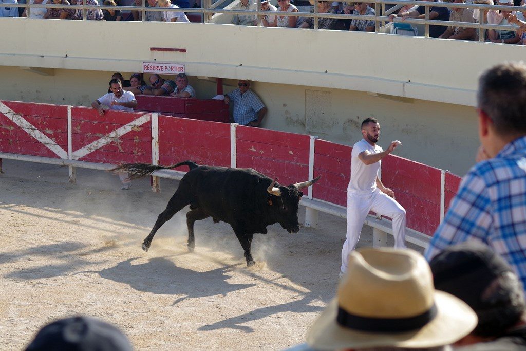 La course camarguaise, ça n’est pas de la Corrida certes, et même si il y a un coté Interville assez amusant, personnellement je regrette et je suis totalement contre le fait que parfois, lorsque les bêtes sautent par dessus les barrières et pour les faire rentrer à nouveau dans l’arène, les organisateurs utilisent des genres de »pics » montés au bout de leurs lances pour faire sortir les taureaux… Les animaux peuvent également se blesser en sautant par dessus les rembardes… Quand aux raseteurs, ils risquent aussi beaucoup mais ça…c’est le risque, c’est le jeu dirons certains…Ce « sport » reste tout de même bien loin des cruelles et pitoyables Corridas et c’est tant mieux !