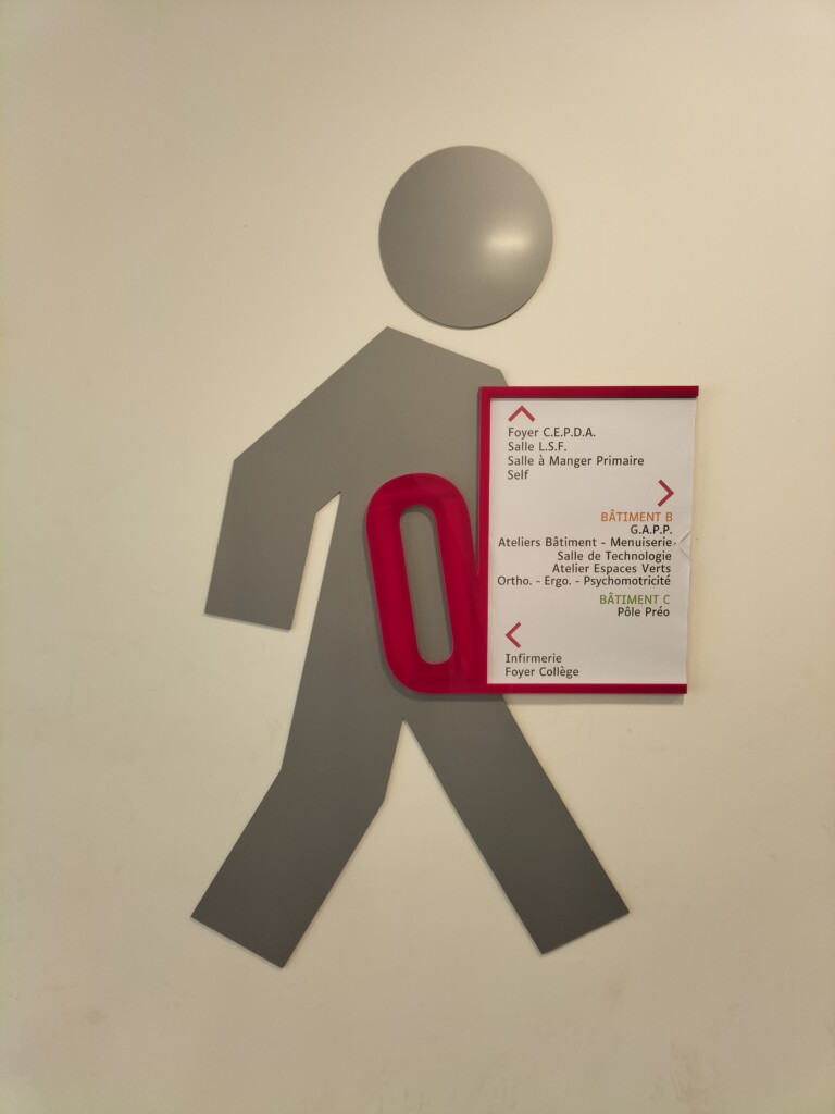 Il nous semblait important pour les enfants, les jeunes, les familles, les partenaires et les professionnels, qu’ils puissent s’orienter facilement et sans aide dans l’ensemble des bâtiments. Guillaume BRISSAUD, un stagiaire en Master II d’ergonomie s’est engagé dans le projet à 100% et a étudié les possibilités qui s’offraient à l’établissement. L’enquête réalisée auprès du personnel a mis en exergue qu’il était nécessaire de mettre en place une signalétique pratique et surtout visuelle.