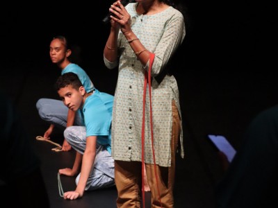 Créateurs de leurs propres danses, les jeunes artistes ont débuté par un travail autour du fil et de l’étirement sur différents niveaux, suivi par des mots qu’ils ont exprimé verbalement ou en LSF lors des retours des 3 premier ateliers puis les ont interprété en mouvements et en Langue des Signes Française : « Amusant, Adapter, Créer, Inventer, Partager, Trajet, Liberté… » Un autre groupe a travaillé sur le rythme et les mains inspiré des « mudras » indiens jusqu’à la création de statuts solo, duo, trio et en groupe en jouant sur les 3 niveaux. Tous se sont enfin rejoints pour la pause finale avec des gestes fluides sur de la musique indienne, spécialité de Dolsy Baudry. Enfin, ils ont terminé par la salutation indienne guidée par Dolsy pour remercier et saluer le public.