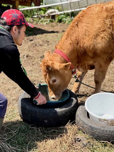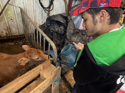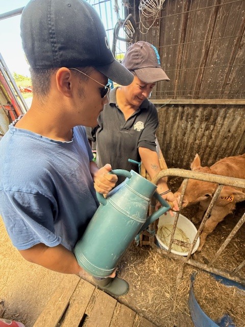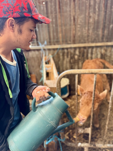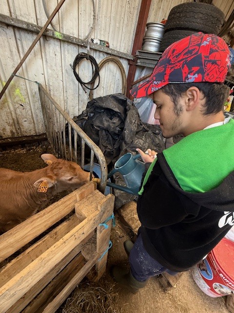 Evan souhaitait travailler en Esat. Il vit à la Plaine des Cafres, où ses parents gèrent une exploitation agricole élevant des bœufs péi. La région offre peu de transports en commun, et Evan se fatigue rapidement. Malgré cela, chaque mardi, il m’attend, prêt à apprendre et à accomplir les tâches qui lui sont confiées. Avec sa mère, nous avons déterminé ce qu’il pouvait faire pour aider. Il s’occupe des veaux, les nourrit, ce qui est physique et exige de la concentration, tout en luttant contre ses pertes d’équilibre.