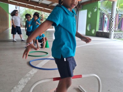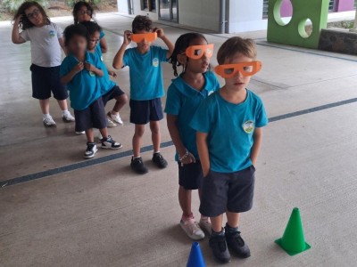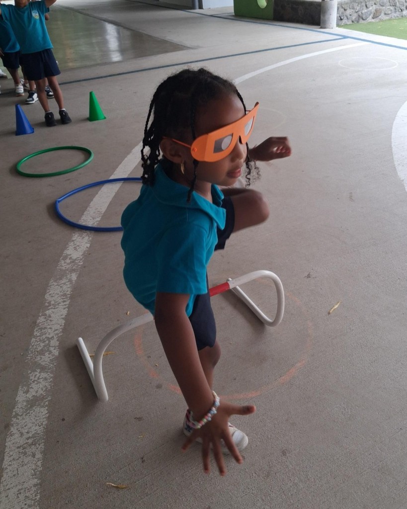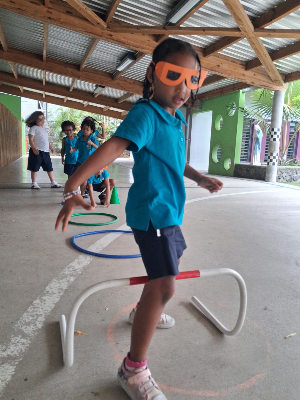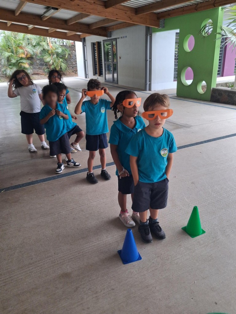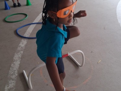 - Un atelier de parcours de motricité (sauts dans des cerceaux, franchissement de haies, slaloms, lancers de balle…) avec des lunettes de simulation DV pour permettre aux élèves de prendre conscience de la déficience visuelle en contexte.