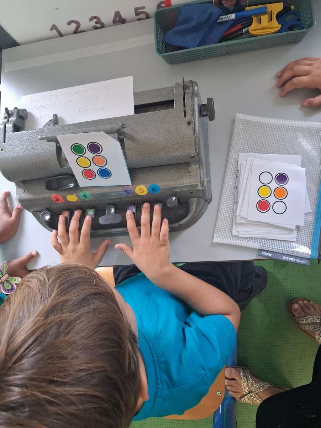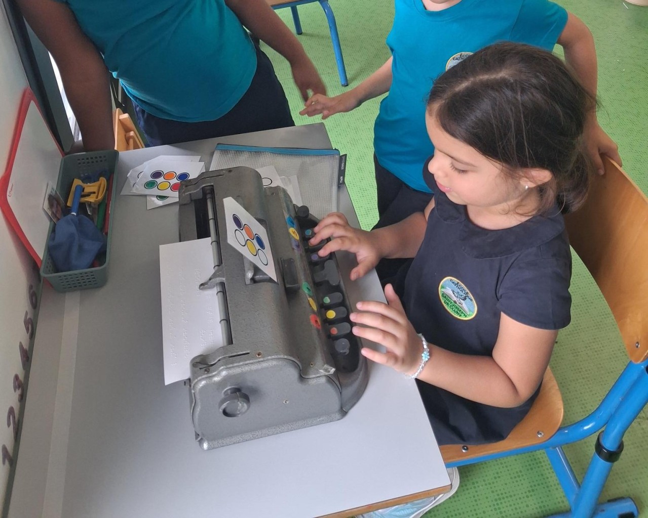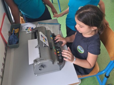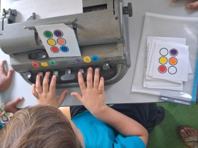 - Un atelier sur la découverte du braille avec des petits jeux de lego-braille et de la découverte de la machine Perkins de manière ludique.