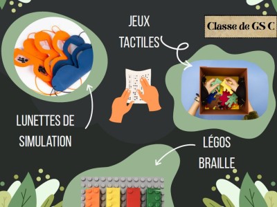Une sensibilisation à la Déficience Visuelle a été proposée à une classe de grande section. Les élèves sont venus à tour de rôle par groupe de 5 pour 3 ateliers successifs dans la semaine :