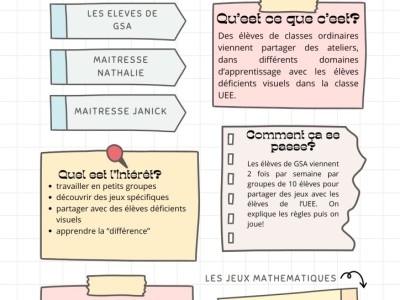 Un projet « smart games », dans lequel 7 ou 8 élèves sont venus sur l’UEE pour découvrir et partager des jeux avec les élèves DV (déficience visuelle), 2 fois par semaine à tour de rôle sur 4 semaines. Les smart games sont des jeux de réflexion et logico-mathématiques qui permettent à chaque enfant d’avancer à son rythme en fonction de son développement cognitif, grâce à un système de fiches évolutives. Ils peuvent se jouer seuls ou à plusieurs.
