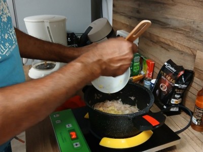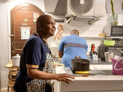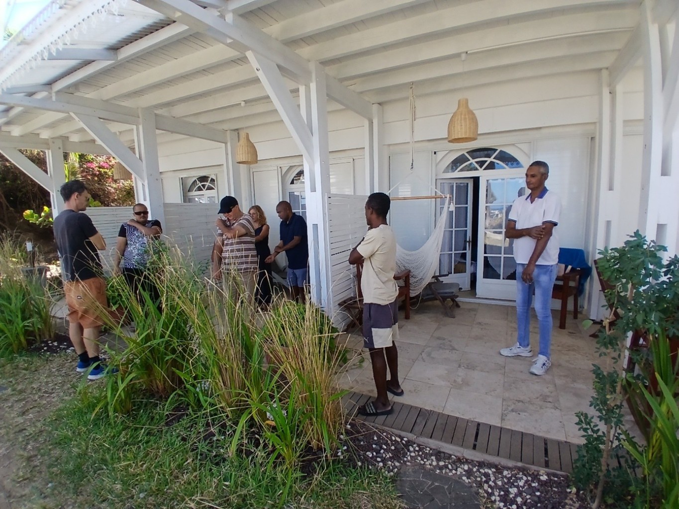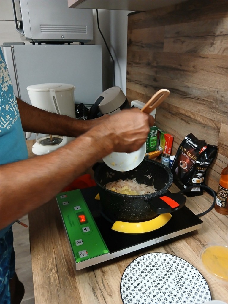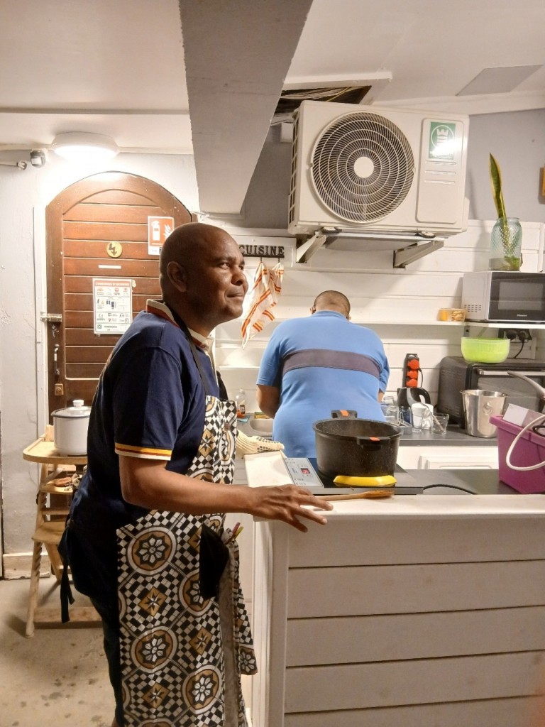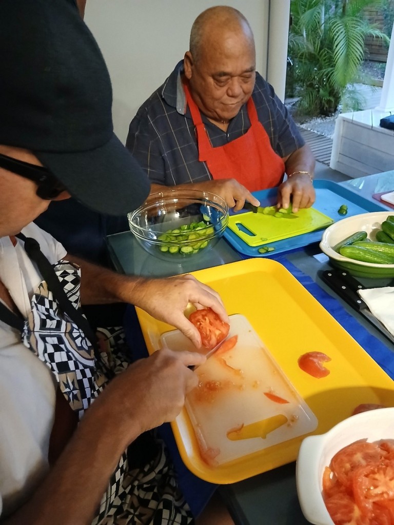 La préparation pour le menu du soir a été dense car 2 plats principaux ont été cuisiné, un carry poulet brèdes et un carry crevettes, ainsi qu’une entrée avec une salade de tomates concombres et un dessert avec une salade de fruit. La confection de ce repas a été riche en échanges, en expérimentations et en découverte de nouvelles méthodes, techniques et matériel pour cuisiner en sécurité.