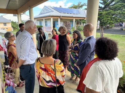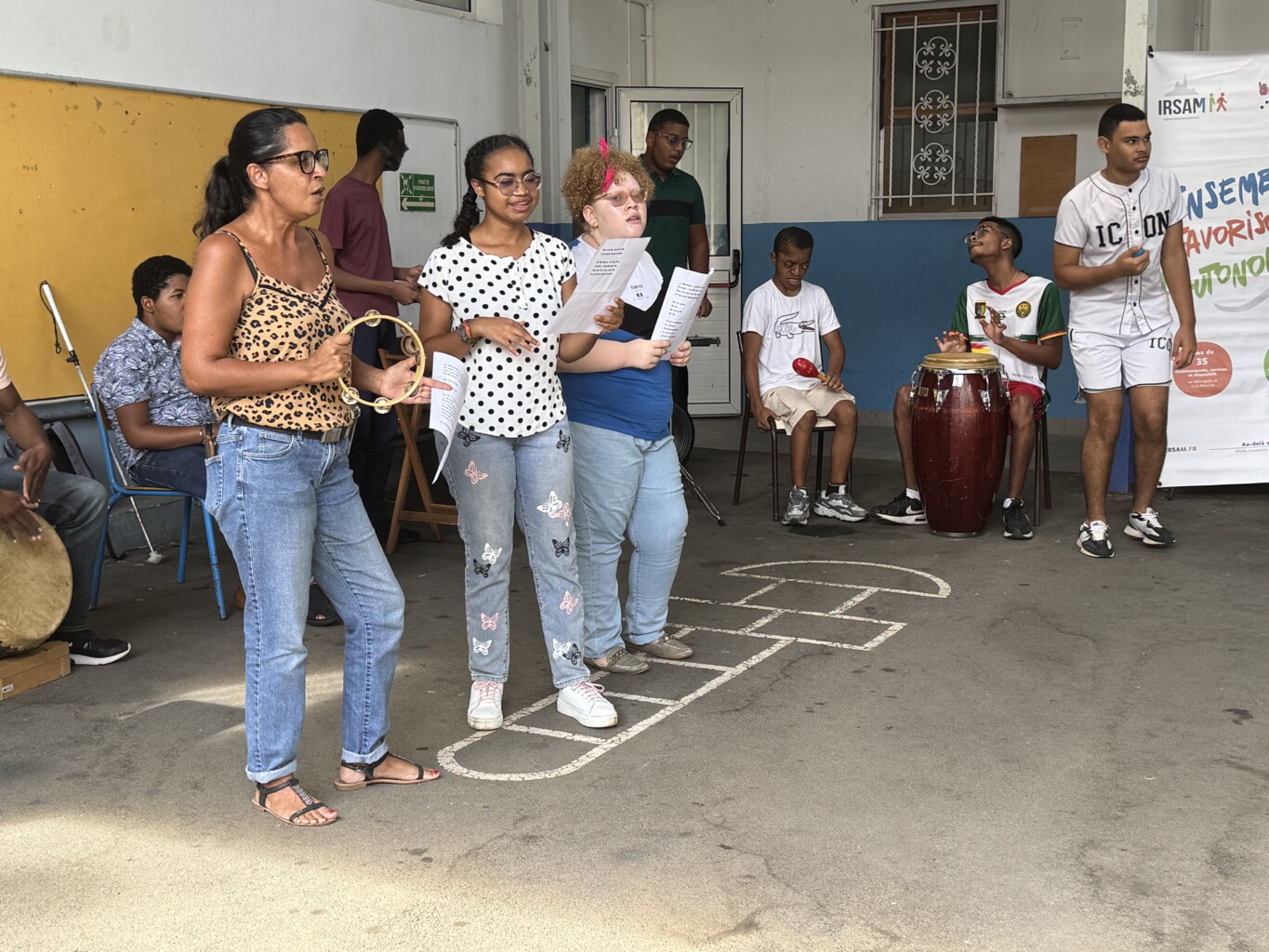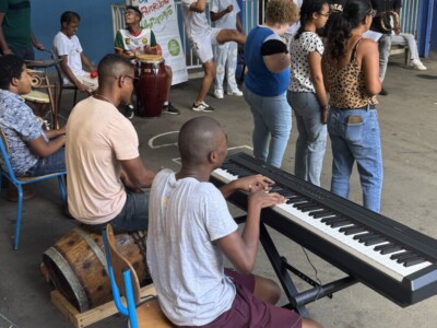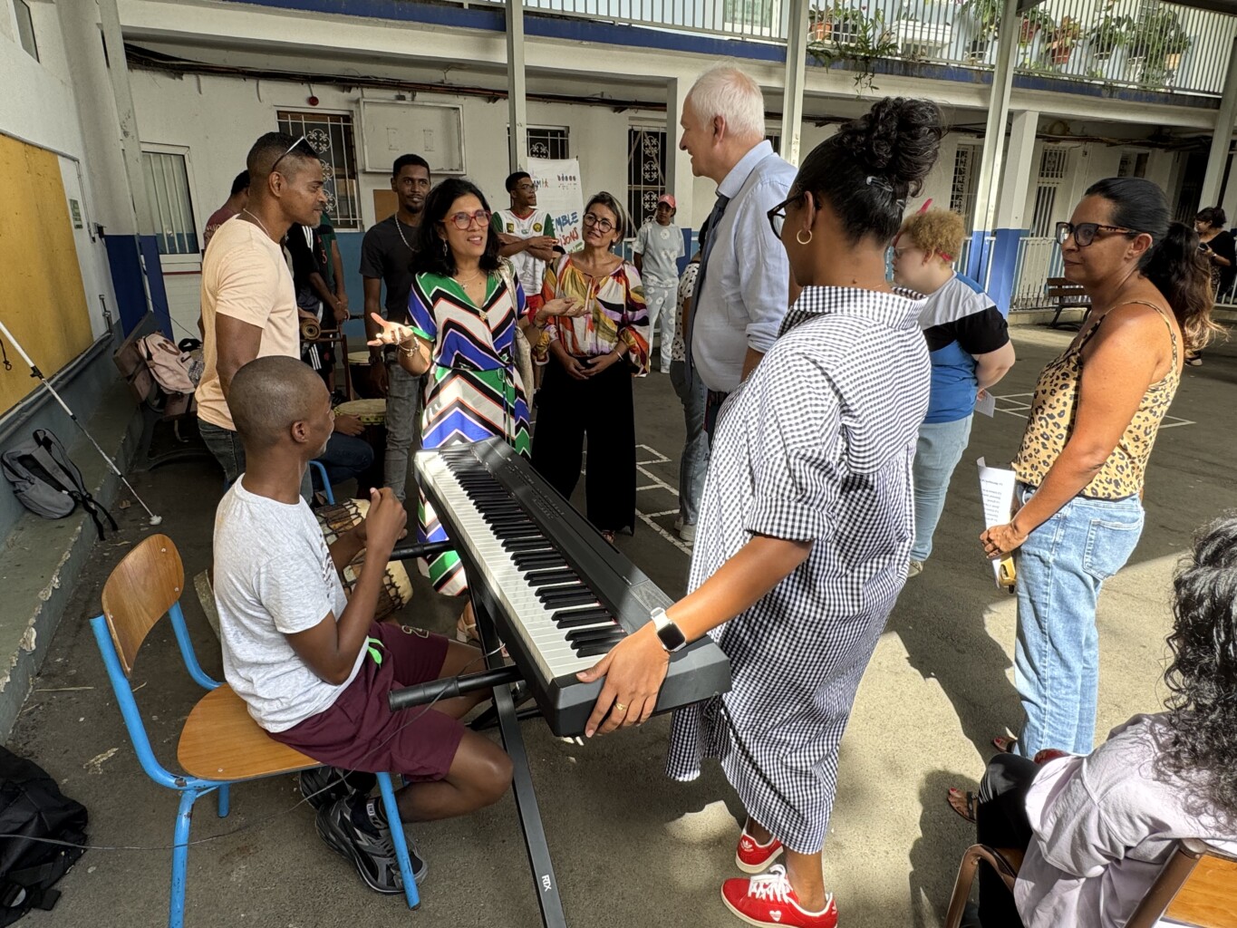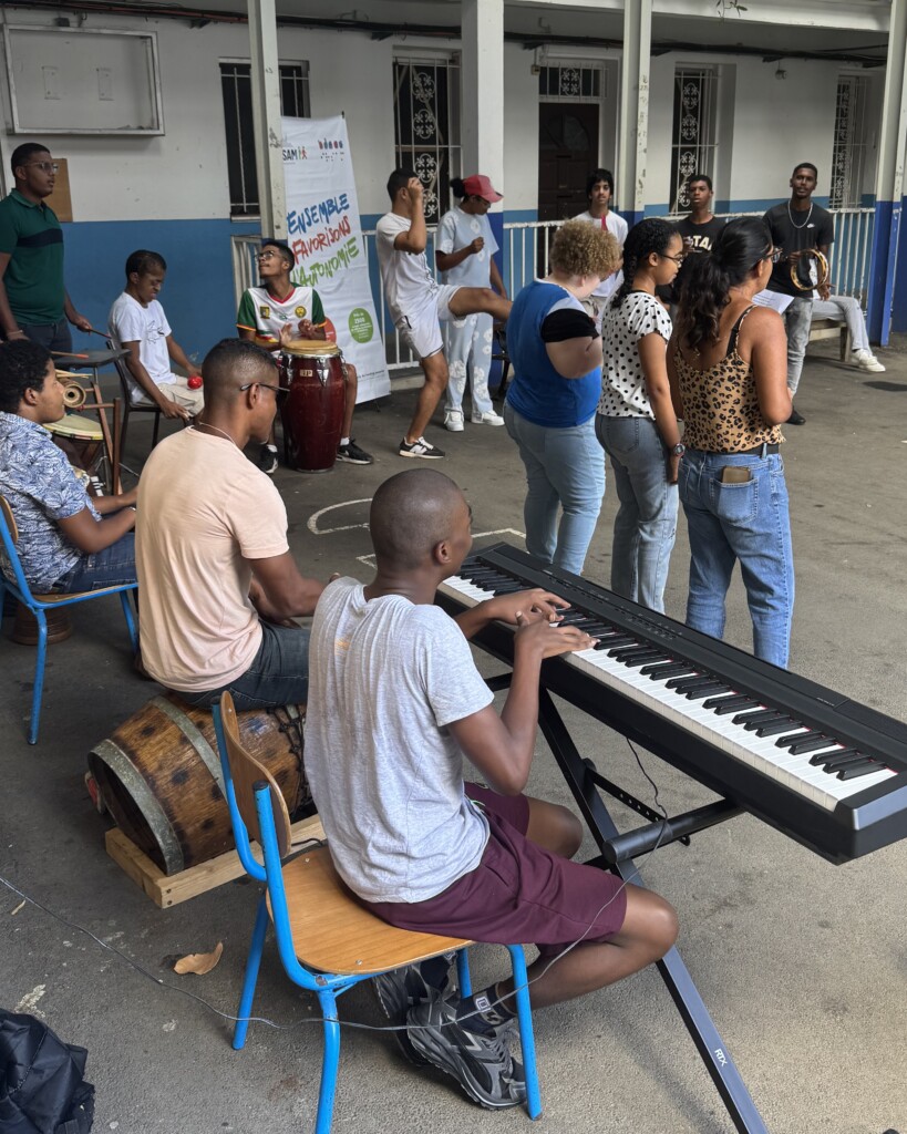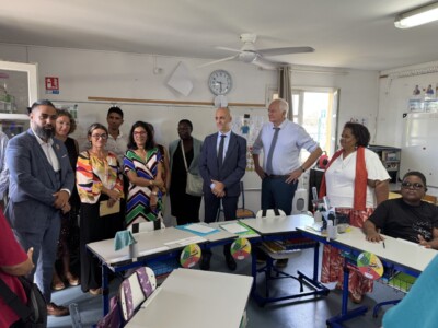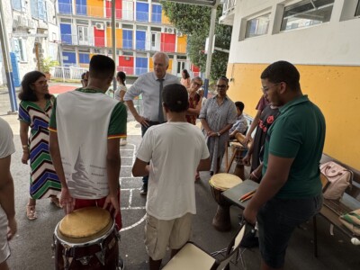 La visite s’est ensuite poursuivie à Sainte-Marie, dans les locaux de La Ressource. Les visiteurs ont été chaleureusement accueillis en musique par le groupe Zarboutan, composé de jeunes du service PAIPS, mettant à l’honneur la culture et les traditions créoles.