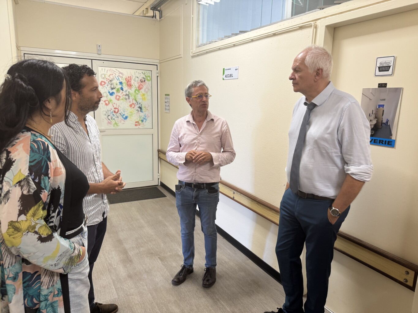 Le Directeur Général de l’ARS a ensuite visité l’Accueil de Jour de IRSAM Les Cascavelles à Sainte Marie. Bruno DRONEAU, Directeur IRSAM Les Cascavelles, Yannick PAYET, chef de service, et Flora HOMESPUN, cadre de santé, ont présenté l’établissement d’accueil médicalisé. Jean-Jacques COIPLET a rencontré les adultes accompagnés avec Troubles du Spectre de l’Autisme complexes ainsi que les professionnels. Les différents outils de communication adaptés à ce public non verbal lui ont été présenté, ainsi que les espaces d’accueil et les sorties proposées, un groupe revenant justement de leur randonnée quotidienne.